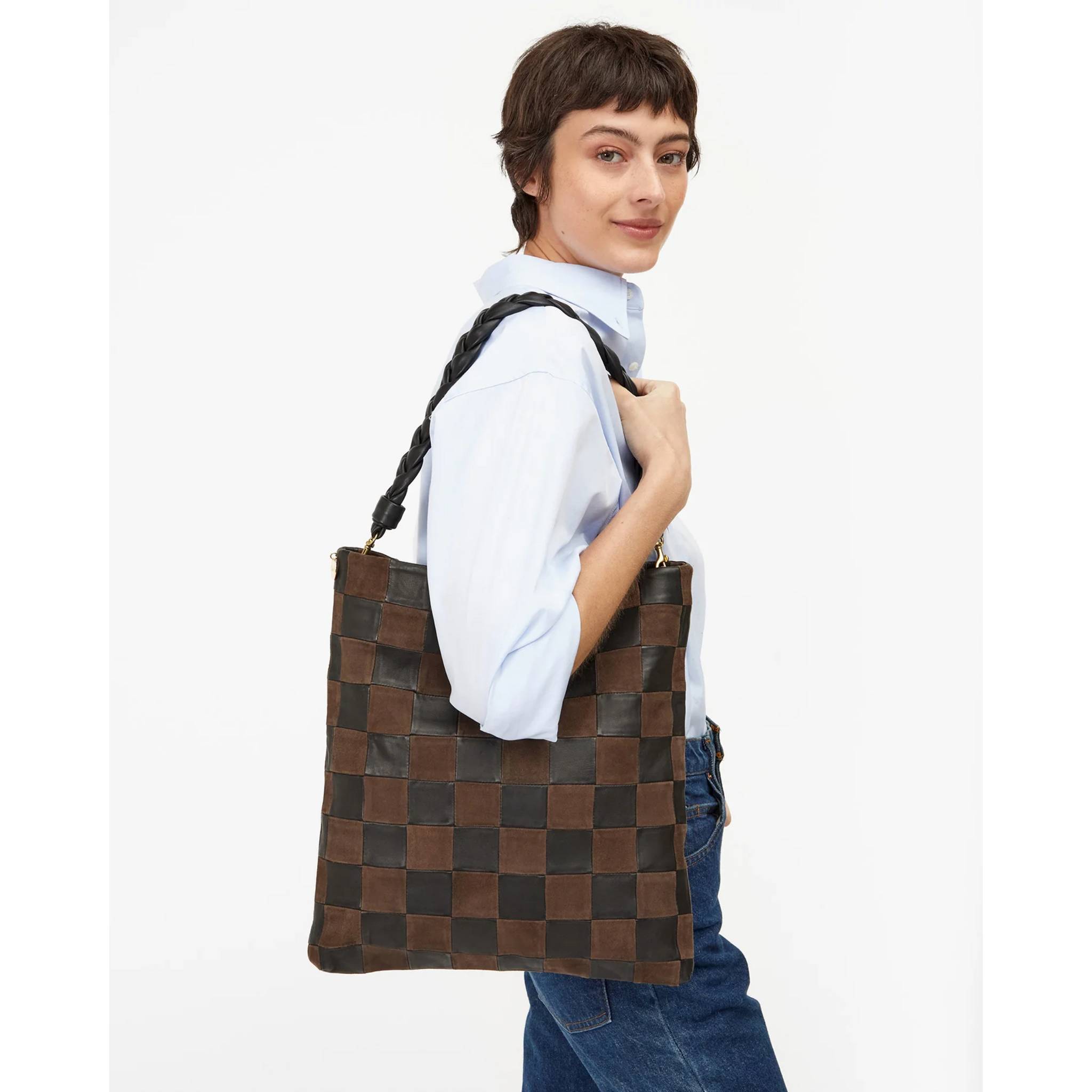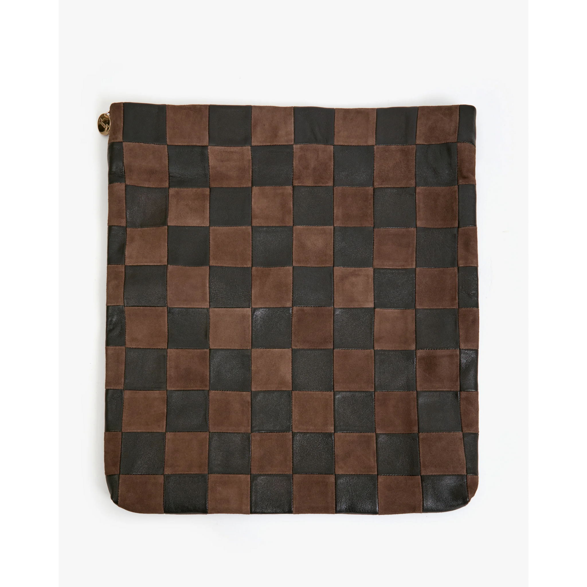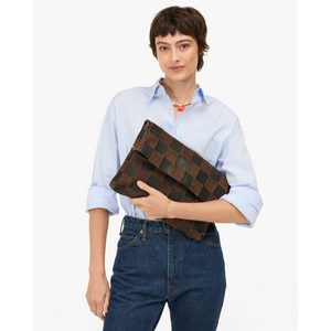 meet the carryall clutch w/ tabs in black/chocolate oversized checker from clare v. this oversized clutch carries it all and is bigger than the foldover clutch, with generous capacity and versatile styling options.