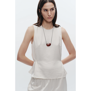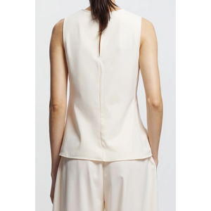 meet the benson charmeuse top in ivory from SAINT ART. this sleeveless top is crafted from smooth charmeuse with a matte and shine contrast, offering a luxurious feel with subtle sheen. featuring ties at the side seams for versatile styling, it brings a sophisticated touch whether worn with tailored pieces or styled casually. pair it with the paige pull-on pant in ivory for a sleek, cohesive look.
