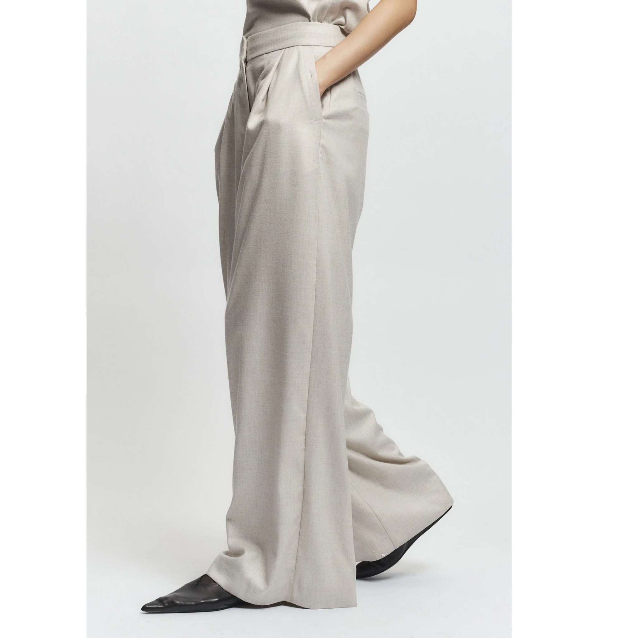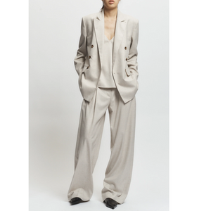 meet the nevin mid-waisted lightweight trouser in oatmeal from SAINT ART. crafted from a soft, breathable viscose blend, these wide-leg trousers offer a relaxed yet tailored fit for a balance of comfort and sophistication. versatile and timeless, they’re designed to pair effortlessly with the sullivan double-breasted blazer in oatmeal for a polished, modern look.