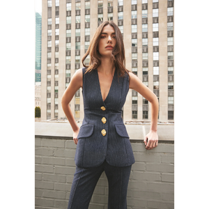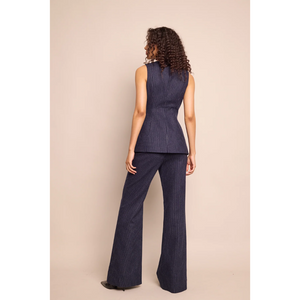 tristan pant, navy chalk stripe from CARA CARA. italian pinstriped fabric