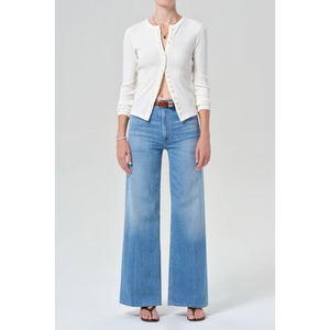 meet the lyra long wide leg in canopy from CITIZENS OF HUMANITY. this vintage-inspired silhouette sits high on the waist with an easy, relaxed top block and a full-length inseam. crafted from soft-stretch regenerative cotton denim, it offers the perfect balance of structure and comfort—effortless, elongated, and endlessly versatile with a modern sensibility.