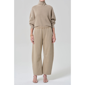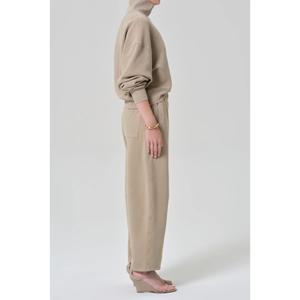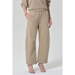 meet the miro sweatpant in catalina from CITIZENS OF HUMANITY. crafted from soft brushed fleece with a cozy, plush feel, this light brown silhouette features a relaxed, tapered fit with a drawstring waist and ankle-length finish—perfect for lounging or styled with matching sweat tops for a coordinated, casual look.