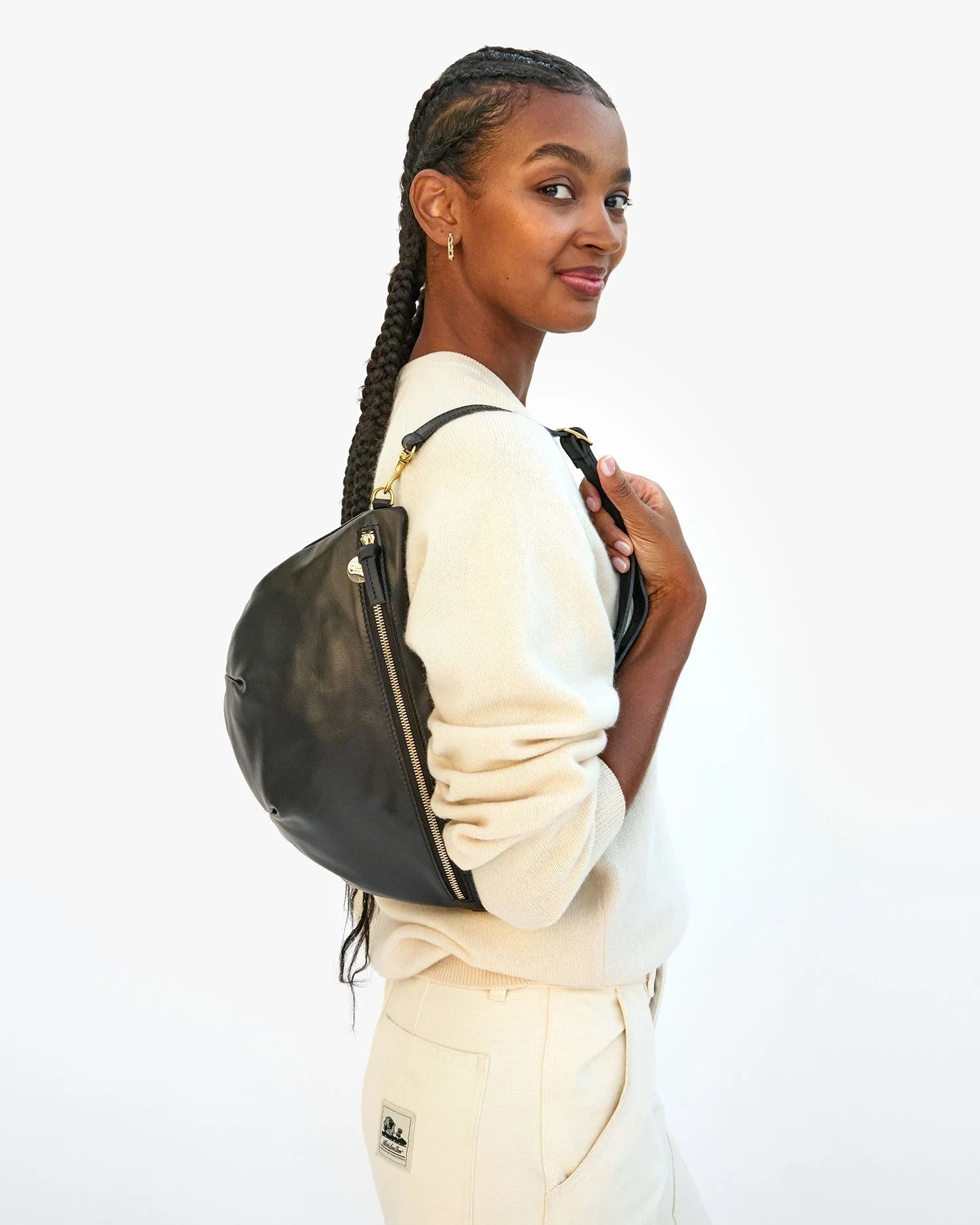 meet the grande fanny in black from CLARE V. this go-everywhere, hands-free bag is a true clare v. classic, designed to be worn crossbody, as a bum bag, or over the shoulder. crafted from chrome-tanned leather with a lined chambray interior and a detachable, adjustable strap, it’s an effortless everyday essential.