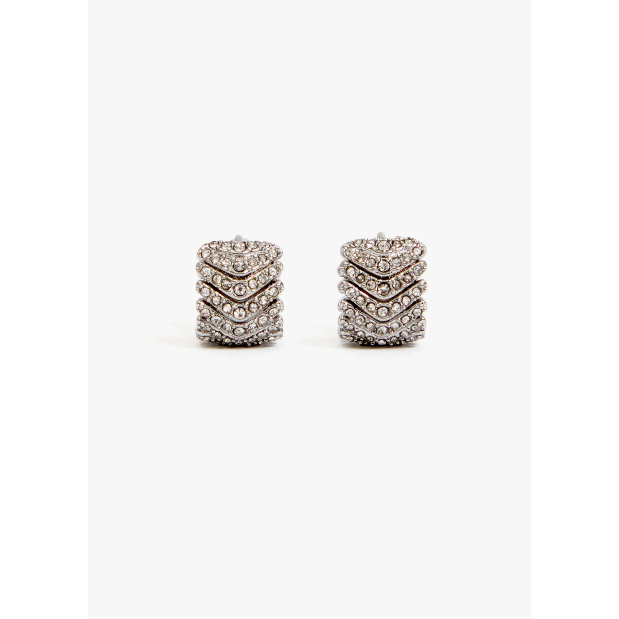 meet the herringbone huggies in clear from CLARE V. these classic huggie earrings feature a herringbone design with extra sparkle, crafted from shiny rhodium-plated brass and pavé glass stones for an elevated everyday shine.