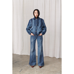 crafted from two pairs of vintage jeans, the odette features E.L.V DENIM’s signature contrast cut and a sophisticated flared silhouette—our most elevated jean. fitted through the high waist and leg with an exaggerated flare at the hem, this upcycled style blends structure with softness, thanks to its rigid denim feel and lived-in touch. no two pairs are alike.