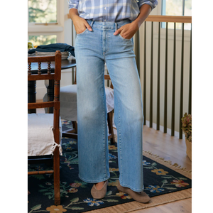meet the galway 32" full-length wide-leg jean in 1972 wash from FRANK & EILEEN. this longer version of the best-selling galway features a mid-rise, wide-leg fit with a finished hem and a comfy trouser-style waistband. crafted from ultra-soft, shape-holding denim using a small-batch stone washing process, each pair is uniquely finished and designed for effortless everyday wear.