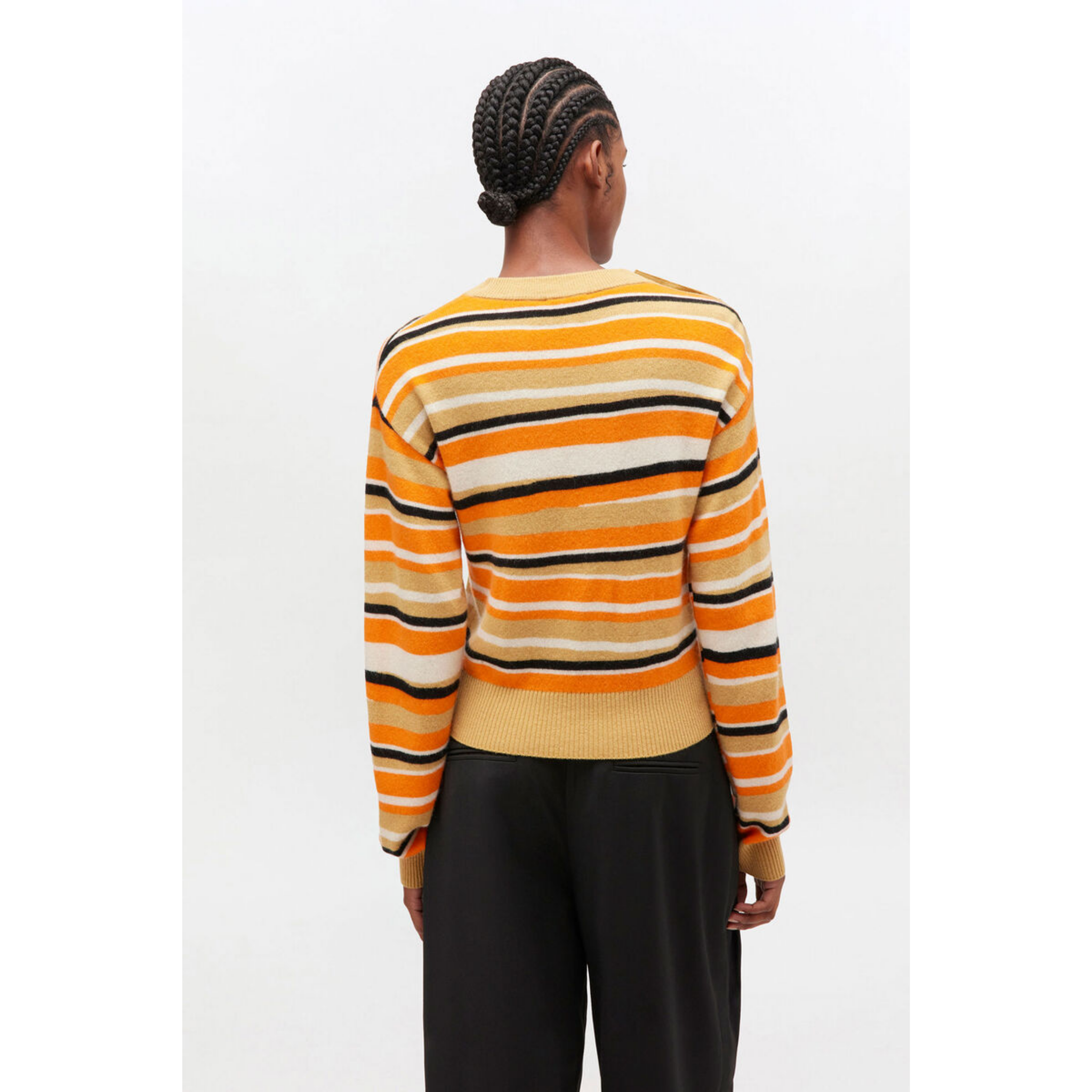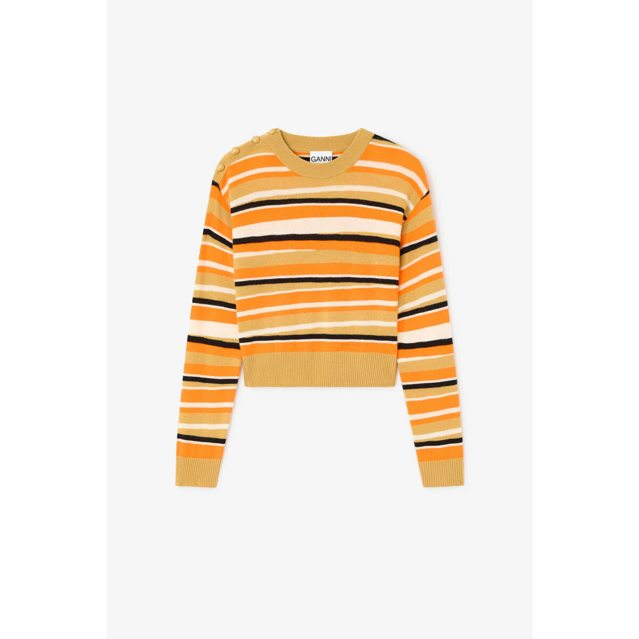 meet the striped cashmere sweater in orange tiger from GANNI. this regular-fit sweater features a classic round neckline with a three-button shoulder detail, long sleeves, and ribbed edges. finished with an embroidered ganni logo, it’s a cozy yet elevated knit crafted from pure cashmere.