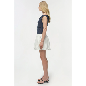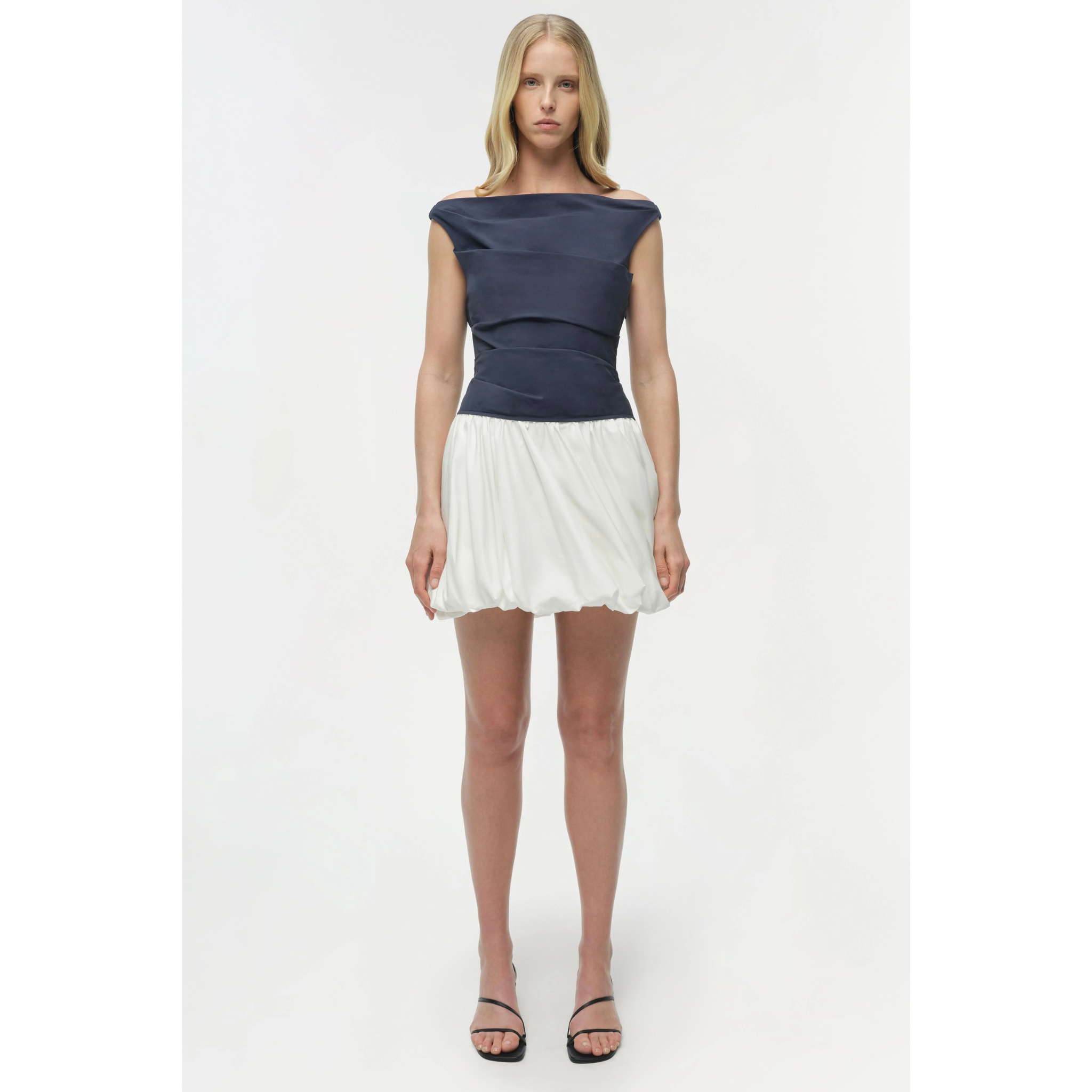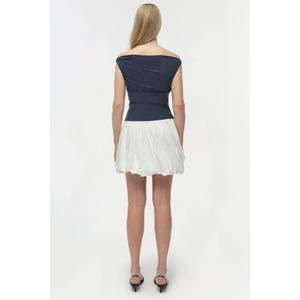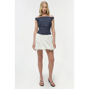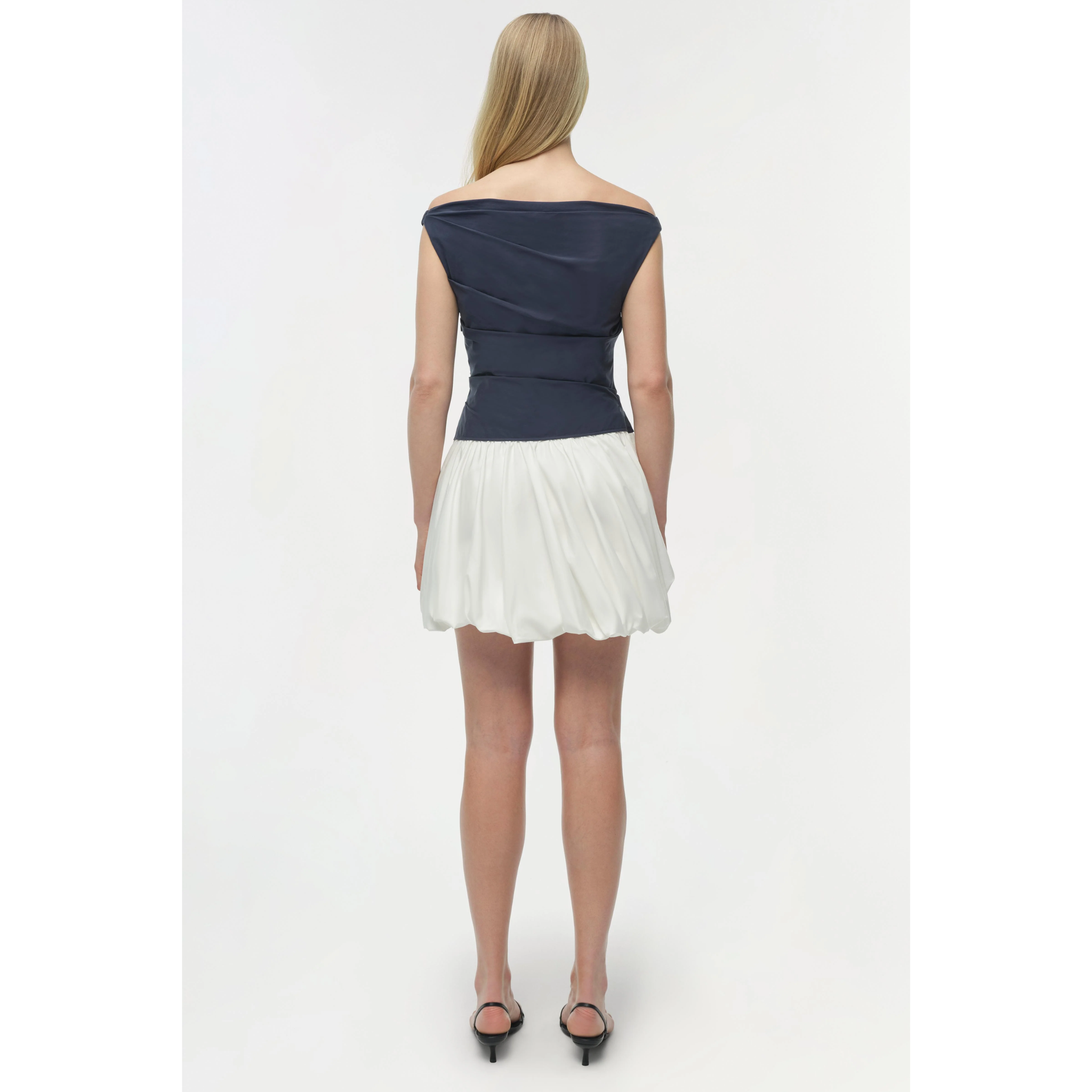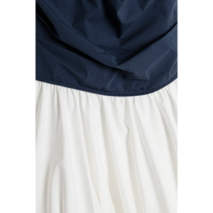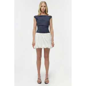 meet the salina bubble mini dress in midnight multi from SIMKHAI. this bubble mini dress is crafted from crisp cotton poplin and designed with a clean boat neckline, a softly ruched bodice, and a voluminous skirt.