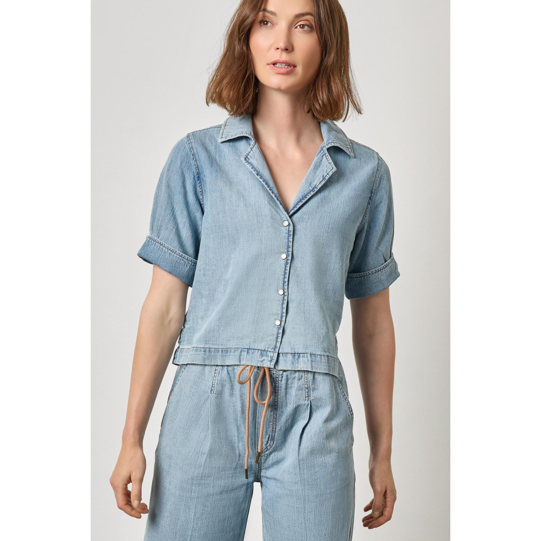 our denim cuffed shirt adds a chic twist to everyday denim. designed in our lightweight 100% cotton denim, this style has elbow-length sleeves with subtle shirring and fullness above the cuff for a feminine touch. pearlized rim snap buttons lend a hint of western flair, while the slightly shorter body length makes it the perfect match for our coordinating denim bottoms. whether styled with matching separates or your favorite pieces, this is a fresh take on the classic denim shirt.