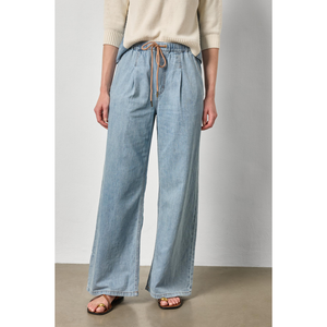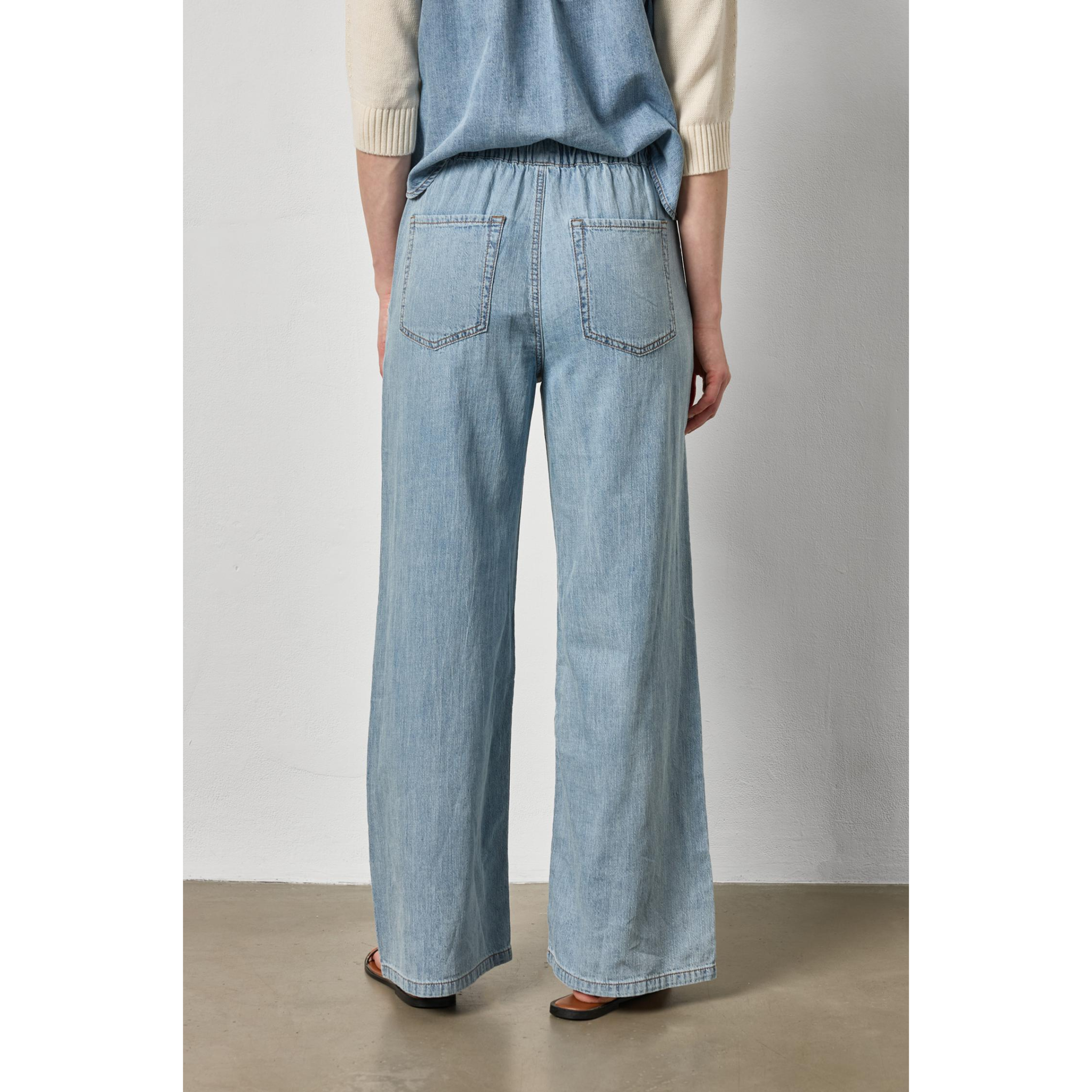 our denim pant combines comfort and timeless style. made from lightweight 100% cotton denim, this full-length, straight-leg style is designed for everyday ease. the elastic waistband and drawcord ensure an easy fit, while front pockets and subtle darts create shallow pleats for a flattering, easy-to-wear shape. these pants are sure to become your go-to all season long and beyond. pair them with one of our coordinating denim tops for a head-to-toe look, or style with a spring sweater or classic tee.