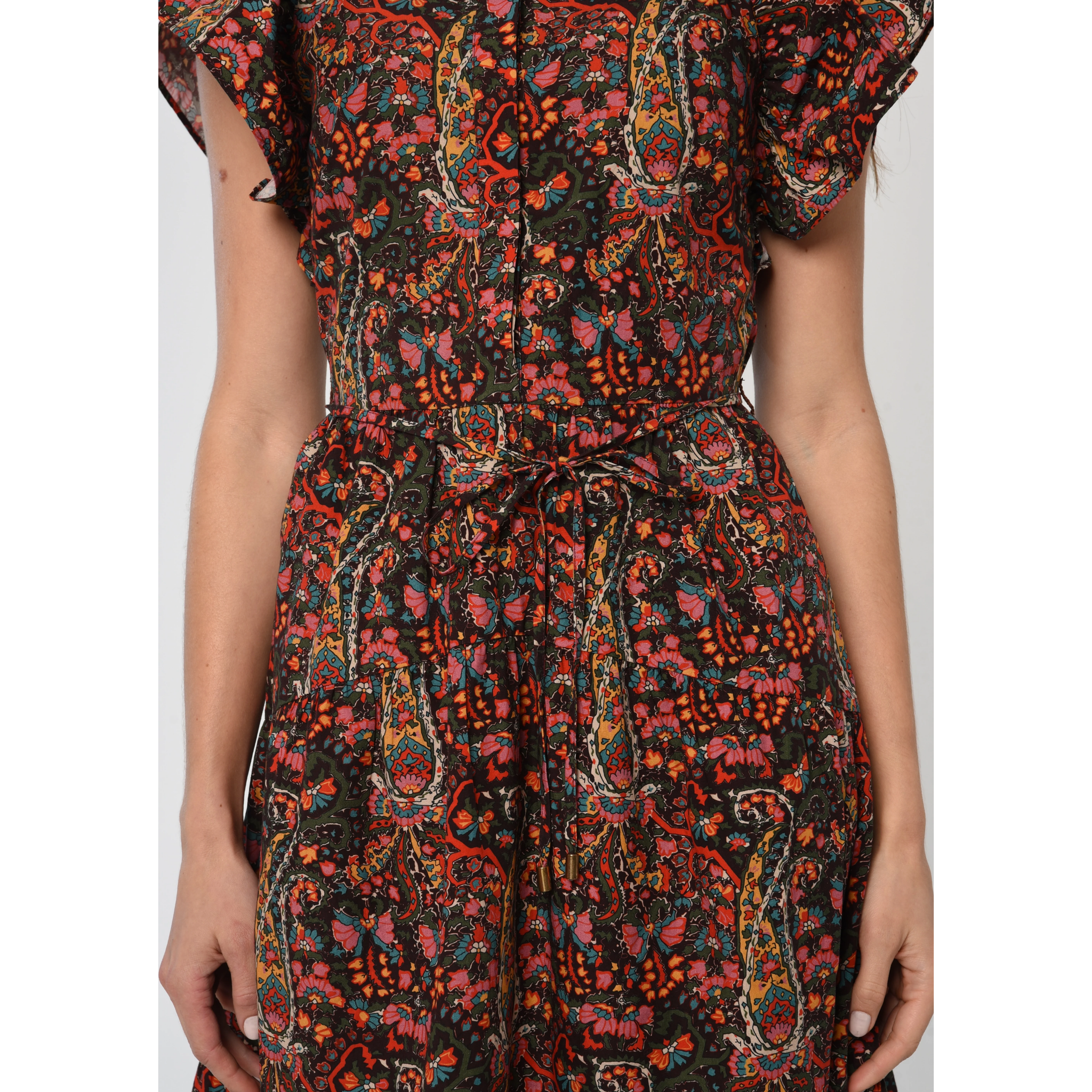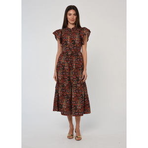 meet the romy dress in harlequin print from LOVE THE LABEL. this flattering maxi features soft ruffle flutter sleeves, a button-down front placket, and a tie waist that creates a beautifully defined silhouette. made for any occasion with an effortless, feminine feel.