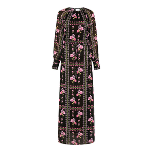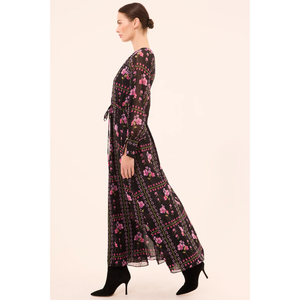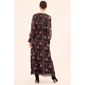 meet the moira dress in midnight lattice chiffon from MISA LA. this timeless maxi dress features a high gathered neckline, long sheer blouson sleeves with structured cuffs, and an adjustable tie waist. the double-lined bodice and skirt flow into an ankle-grazing silhouette with double side slits, finished with a single button keyhole back closure for effortless day-to-night elegance.