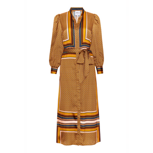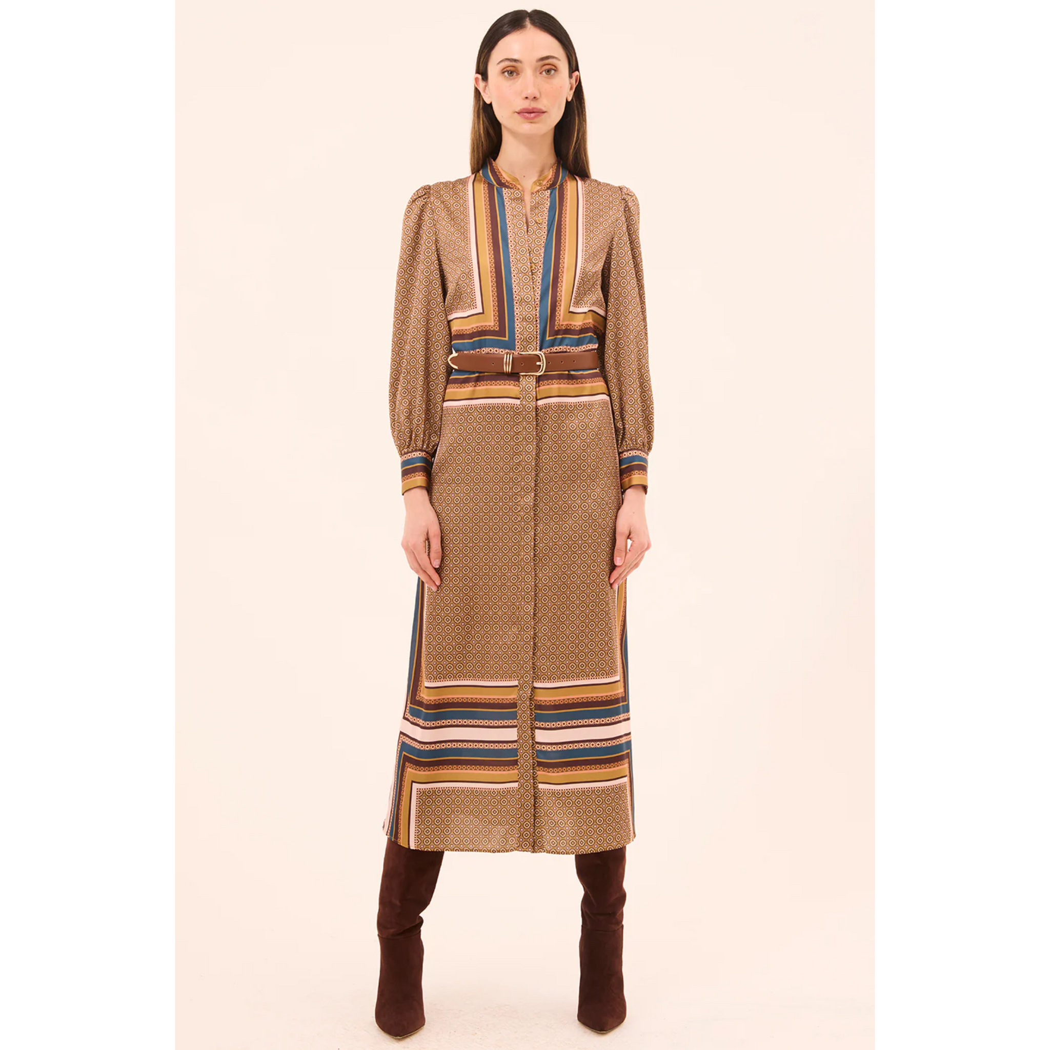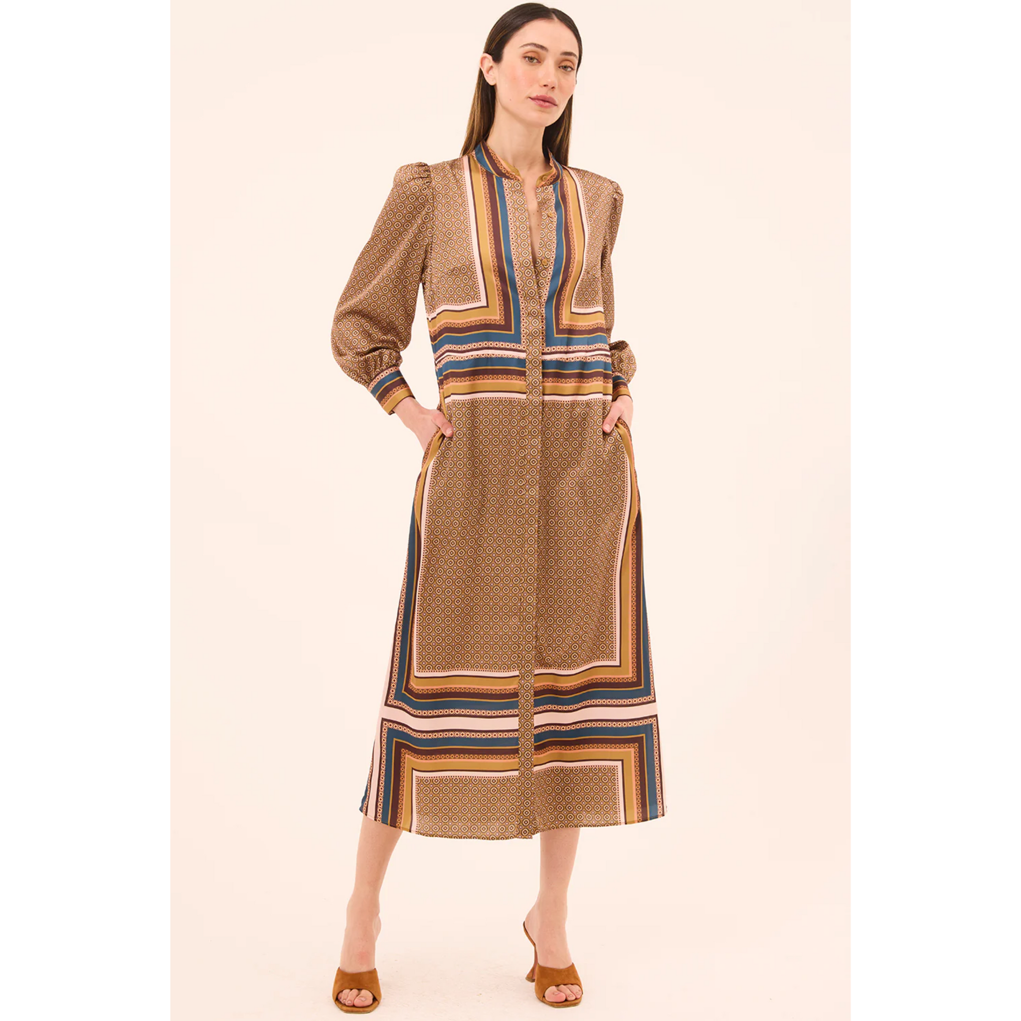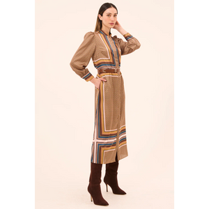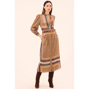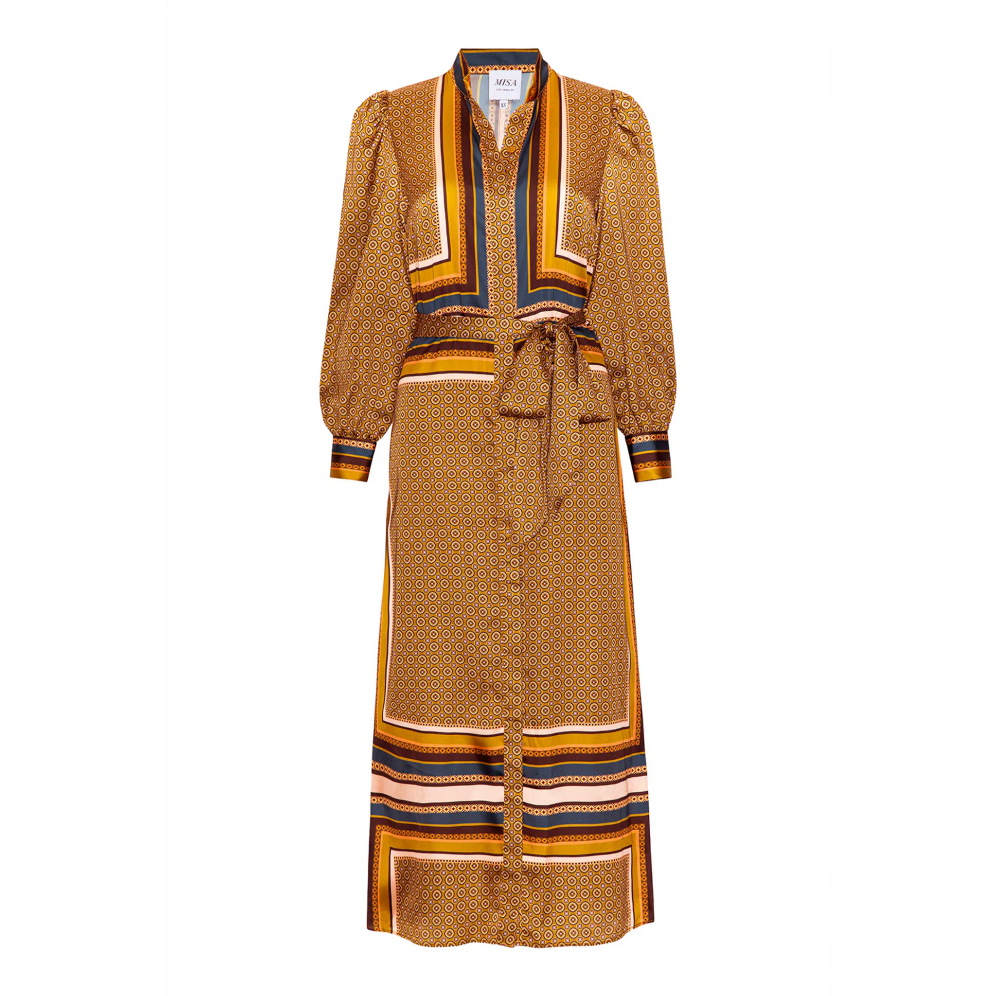 meet the nancy dress in autumn scarf from MISA LA. this chic midi-length shirt dress is cut from satin in a modern autumn scarf print. featuring long blouson sleeves with puffed shoulders, double-button cuffs, a high collar, and a full covered button placket, it balances polish with ease. designed with a clean straight silhouette and side slit pockets, it can be styled with the included matching belt or swapped for a leather belt for added shape.
