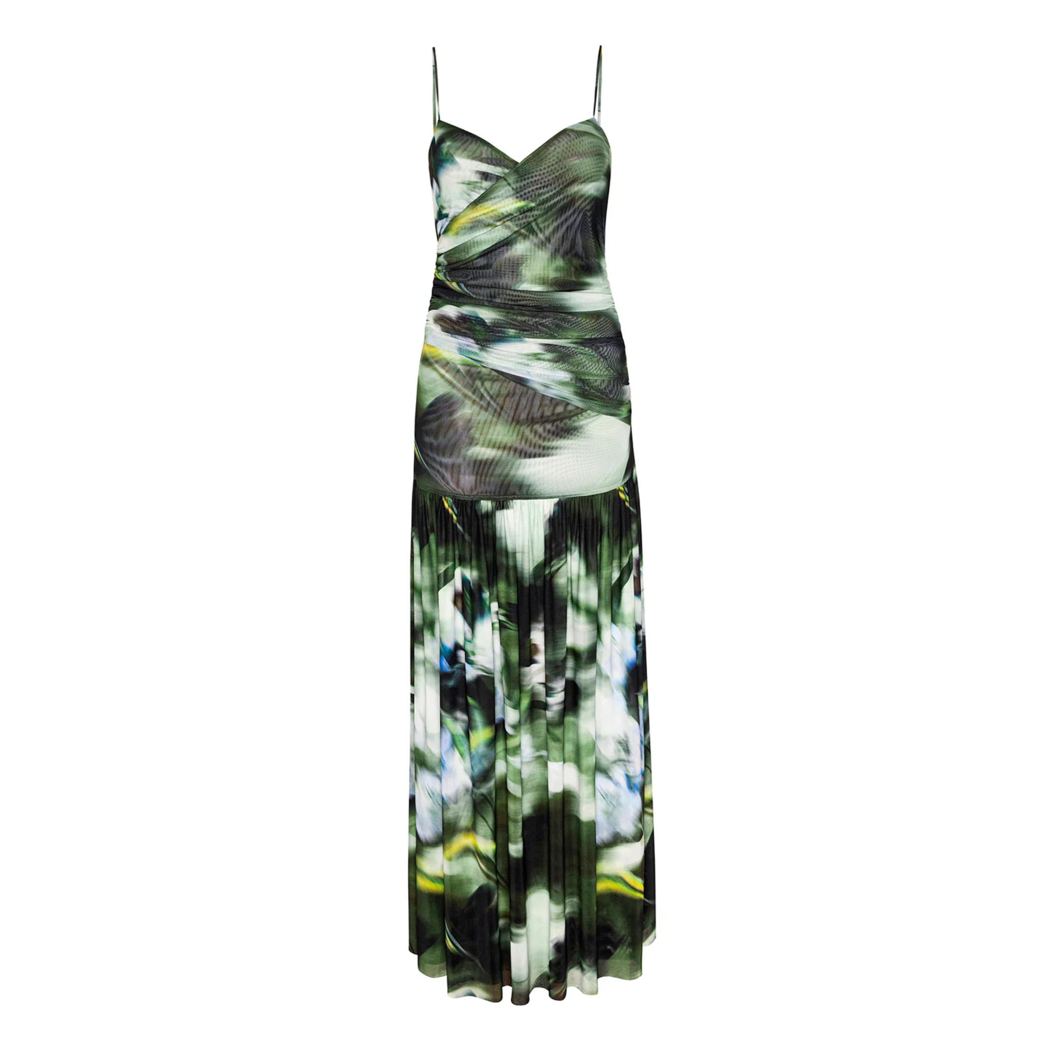 a chic stretch mesh maxi designed with a deep v-neckline and crossover bodice. this flattering silhouette features ruched side detailing, a fitted ruched body, and a drop waist that flows into a loosely pleated maxi skirt. adjustable spaghetti straps and double lining provide added support and coverage, making it an elevated choice for your next event.