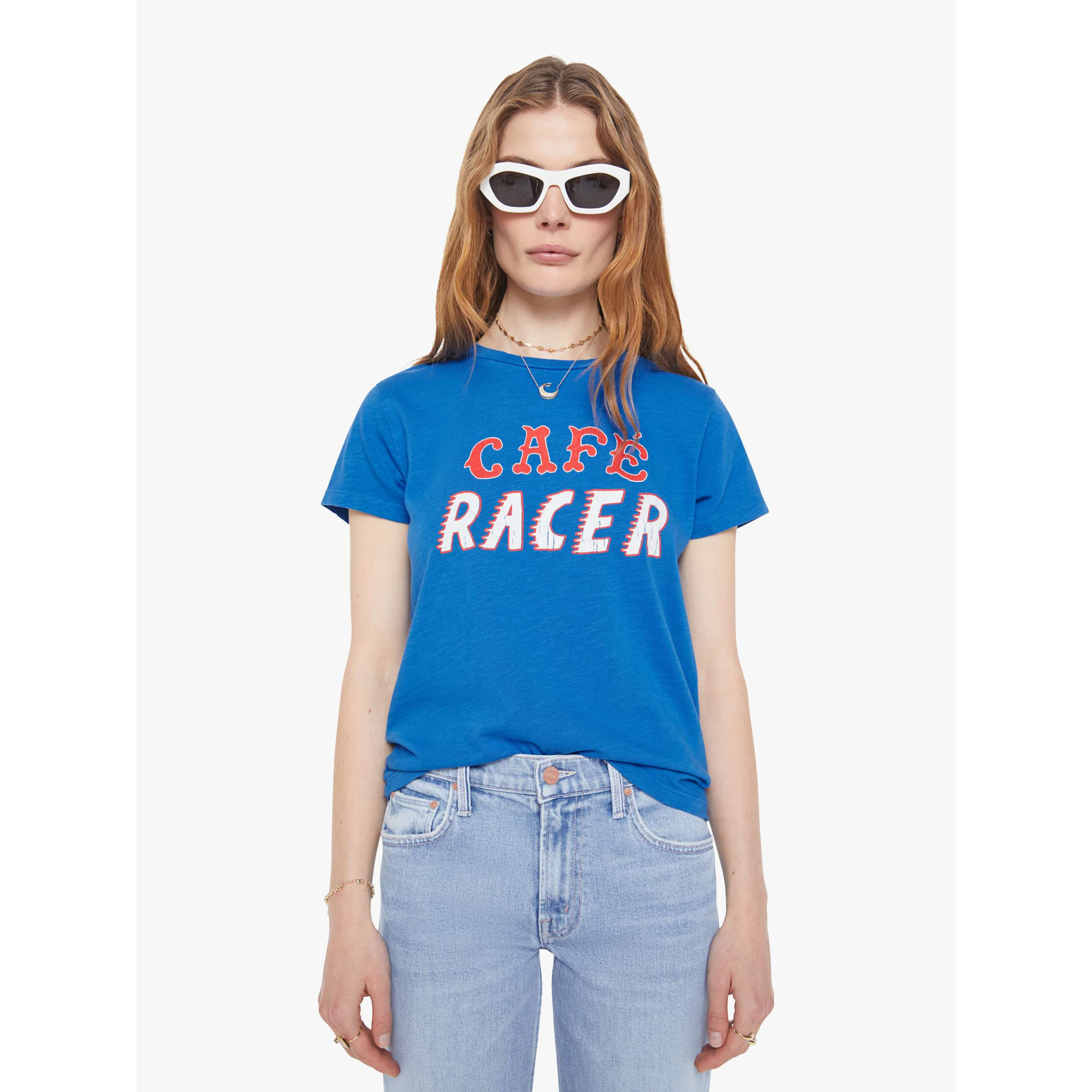 easy rider. a soft crewneck with a slim fit for a vintage look and feel. made from superior 100% cotton in blue, the sinful in cafe racer features a red and white text graphic on the front.