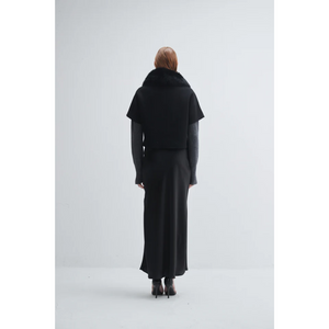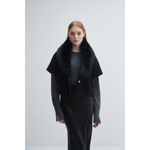 meet the short-sleeve jacket with fur in ivory and black from PISSENLIT. designed with a tailored fit, this short-sleeve jacket features clean lines and a polished silhouette, making it a versatile piece that pairs effortlessly with both casual and formal ensembles. featuring a detachable fur collar, you can wear it with the fur for a glamorous look or remove the collar for a more understated, elegant appearance.
