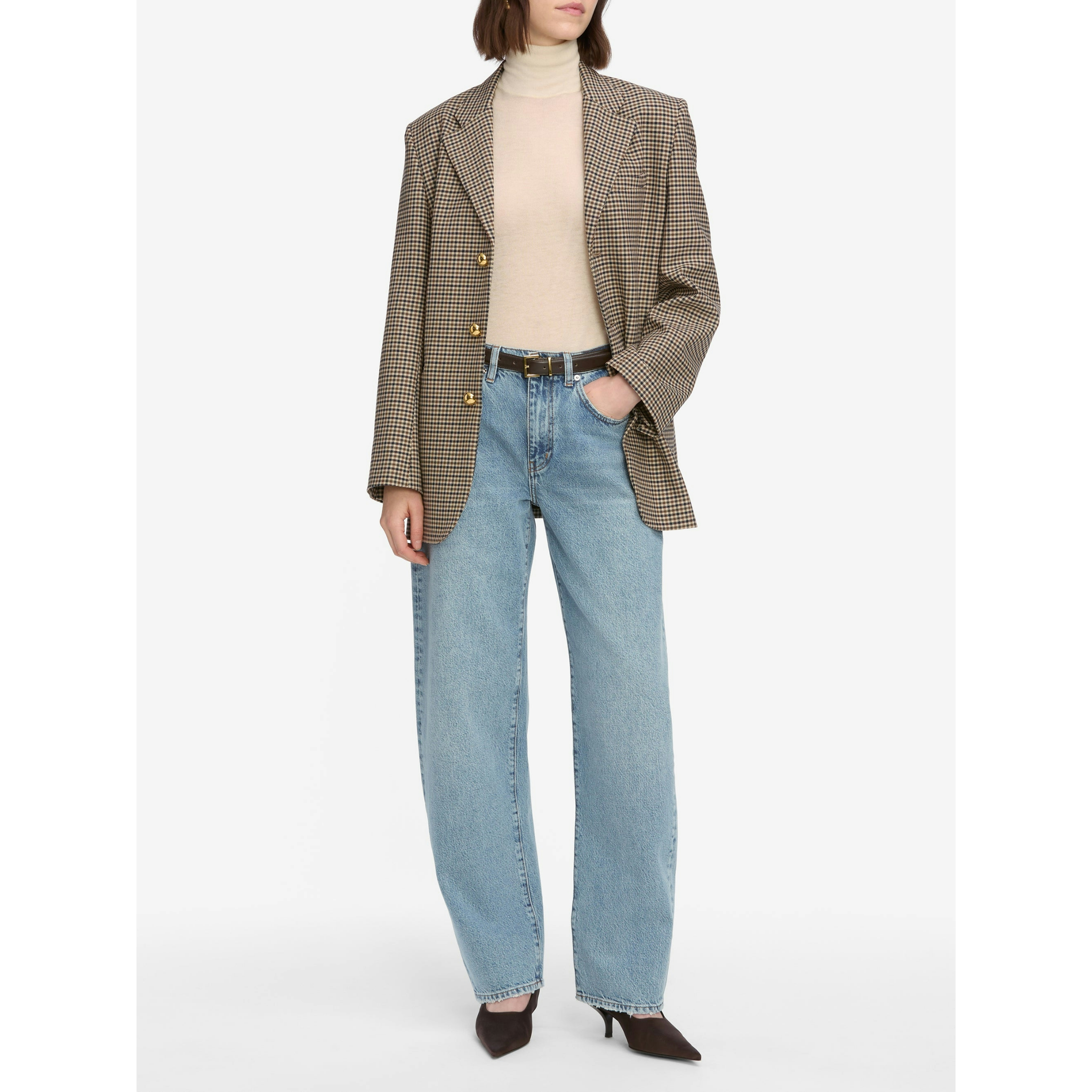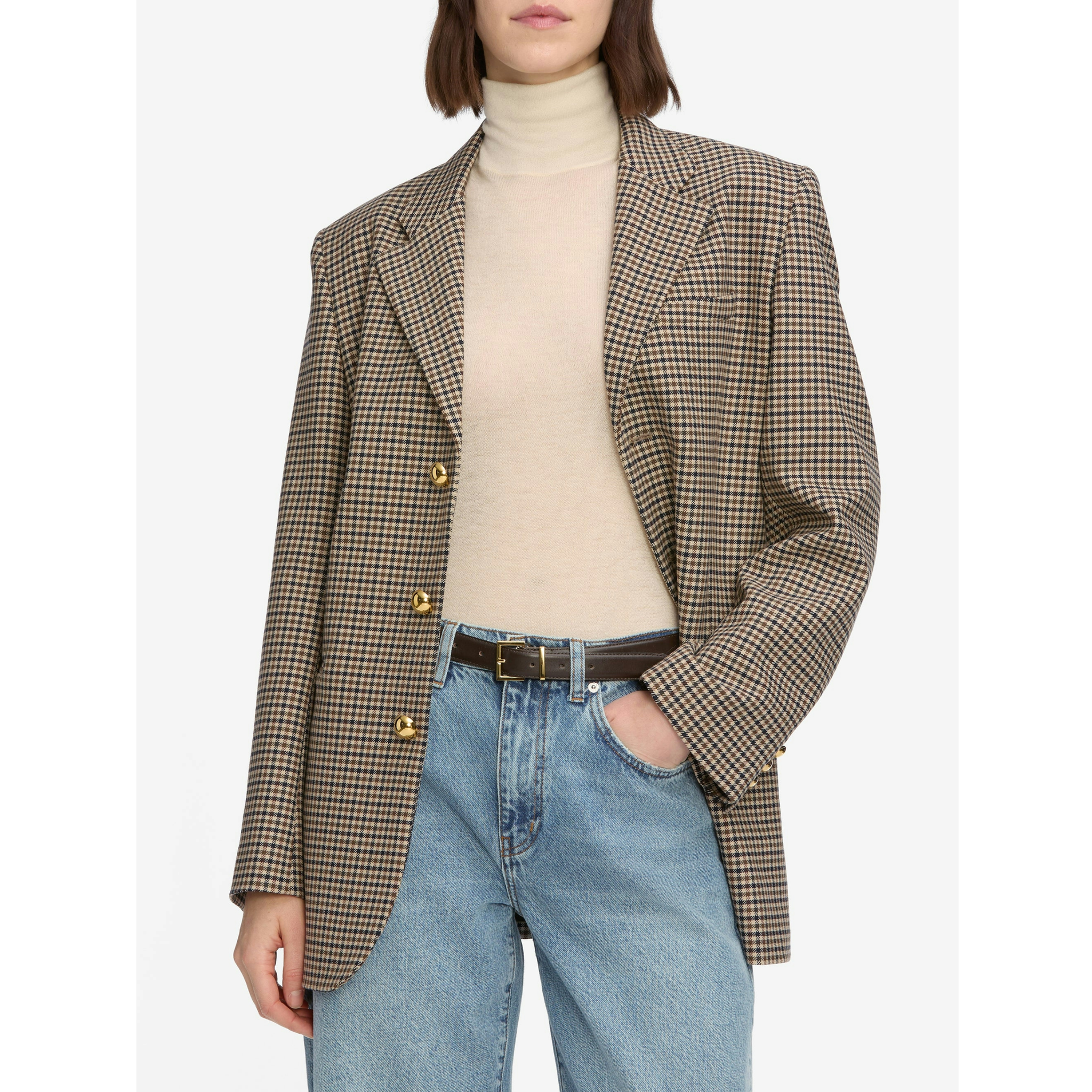 a timeless oversized blazer in navy houndstooth, detailed with gold dome buttons, front pockets, and three-button cuffs. designed for a statement fit—size down for a more traditional silhouette.