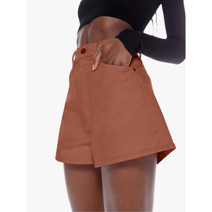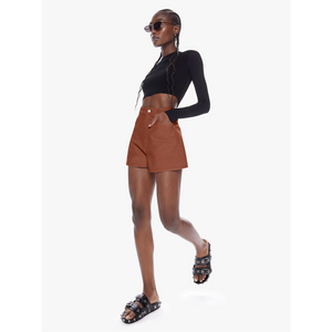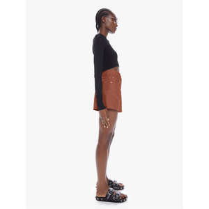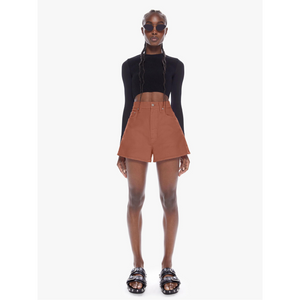 meet the high waisted savory short in caramel cafe from MOTHER. sugar high. denim shorts from SNACKS!, MOTHER's homage to throwback styles of the 80s and 90s. the high-rise shorts are designed with a super-short inseam and a loose, wide fit. made from rigid 100% cotton, caramel cafe is a dark khaki hue that channels the nostalgia of snack time with a pretzel-detailed button and candy-inspired interior rivets.