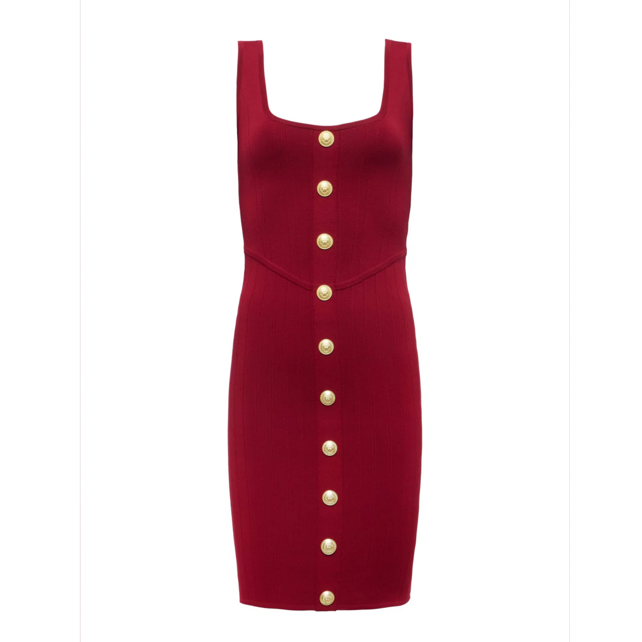 our bestselling button-front dress returns in a rich burgundy hue. crafted in a flattering power knit, the soleil dress features decorative embossed dome buttons and a sleek silhouette with no closures for effortless wear.