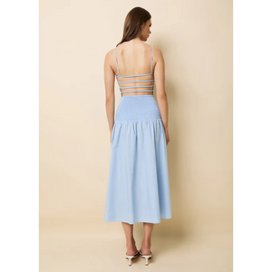 a midi dress featuring a fully smocked body for comfortable structure, designed with a drop waist for a relaxed, modern silhouette. finished with adjustable straps and an updated version of the signature ladder strap back for a feminine touch.
