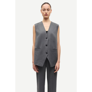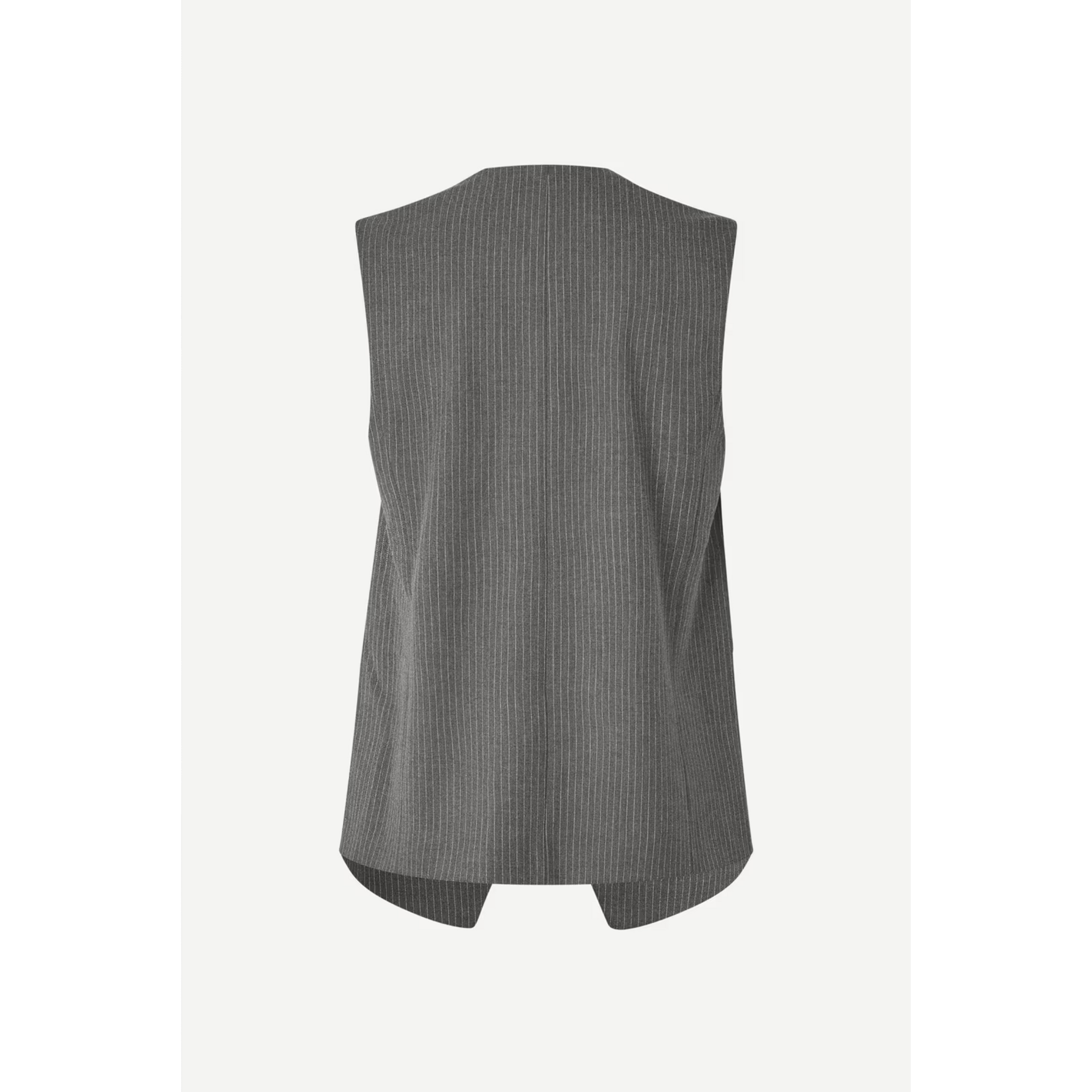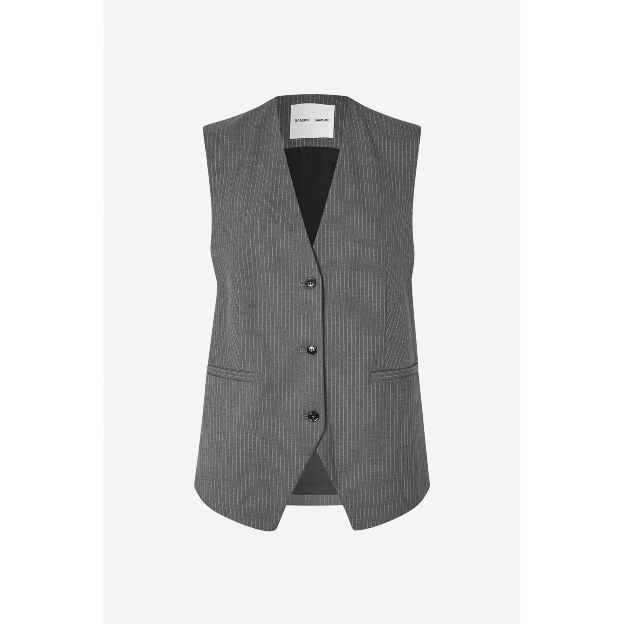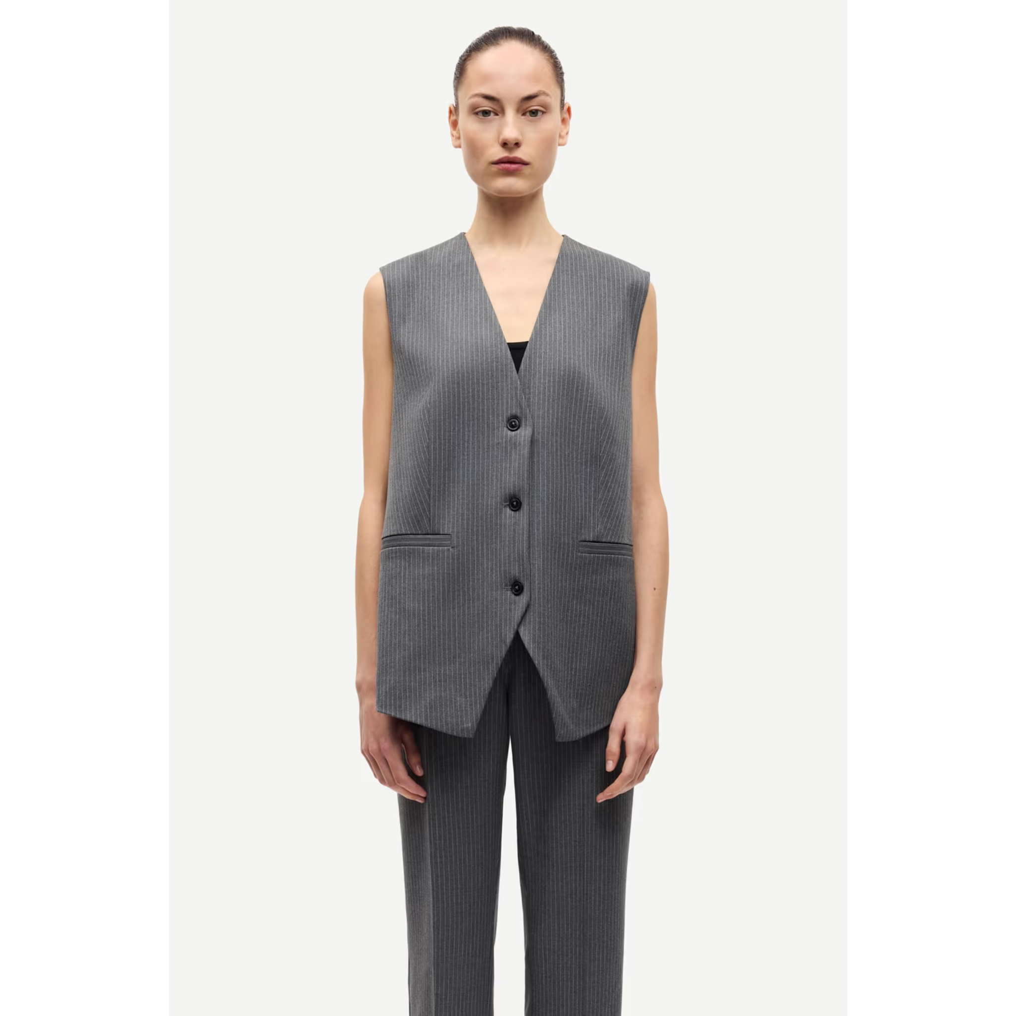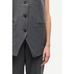 meet the saleni vest in dark gull gray pinstripe from SAMSOE. tailored vest with a loose fit and single-breasted button closure. designed with welt pockets at the front and inside, and fully lined for structure. made from a stretch blend of recycled polyester and lenzing™ ecovero™ viscose, certified with the eu ecolabel for environmental excellence.