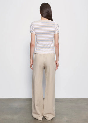 meet the cotton stripe classic s/s tee in wheat/white stripe from ENZA COSTA. our new classic s/s silhouette features an updated stripe detail with a slim fit and bold contrast binding at the neck and cuffs for enhanced durability. made in usa.