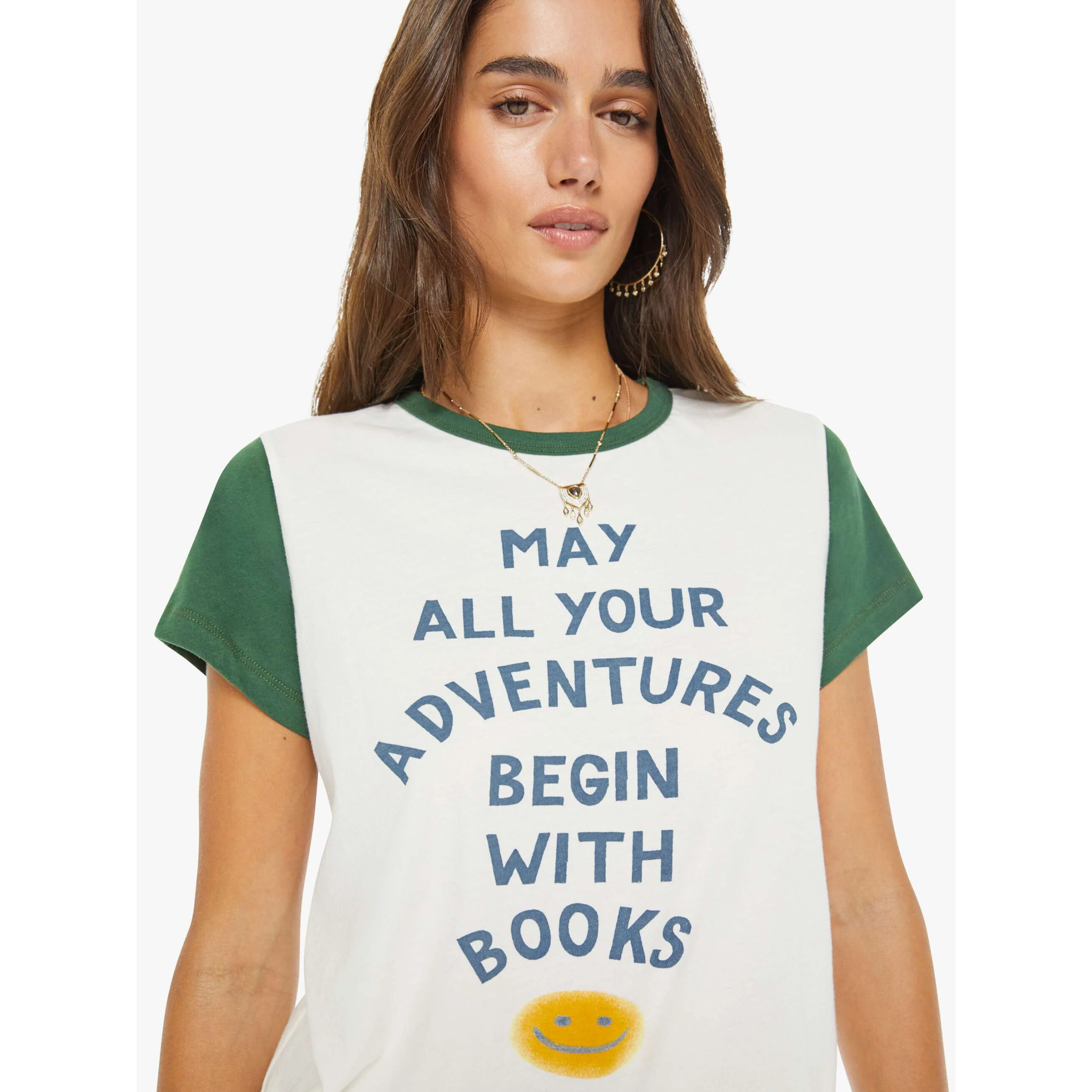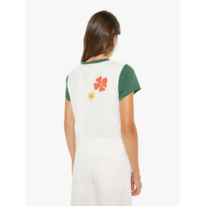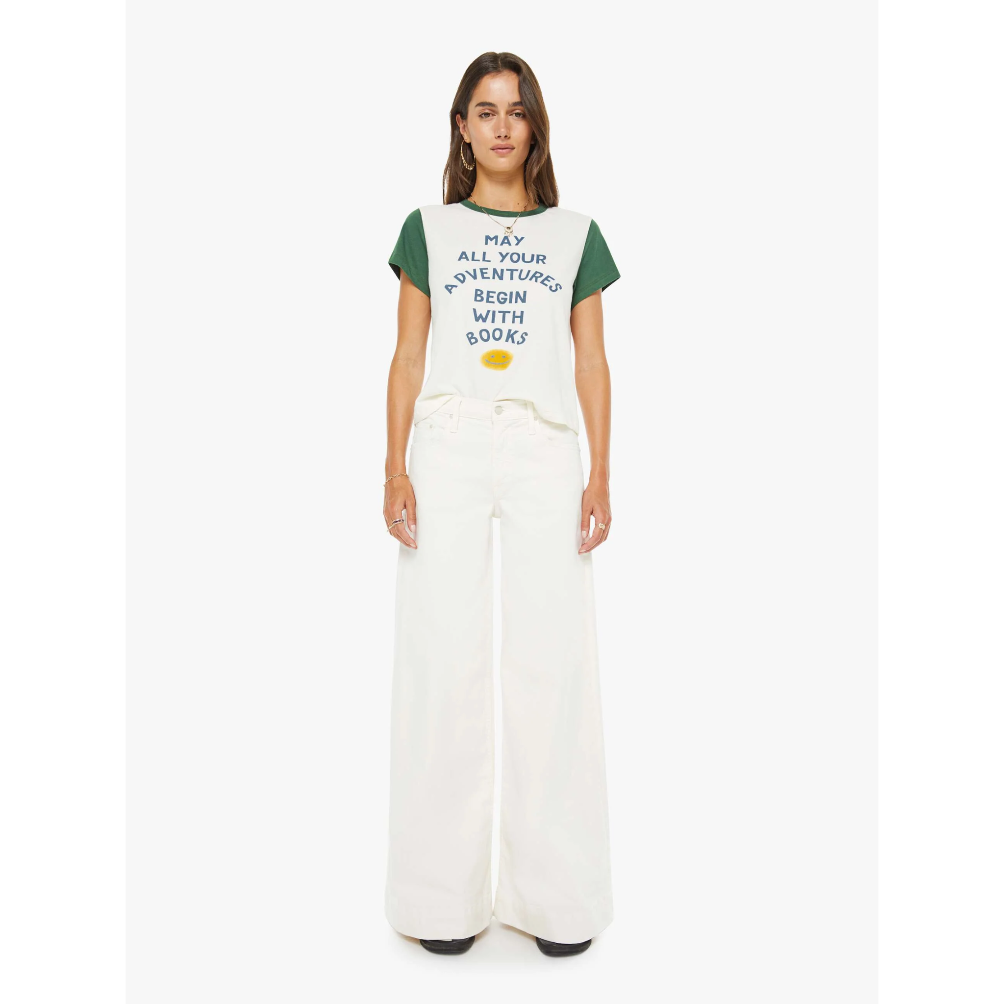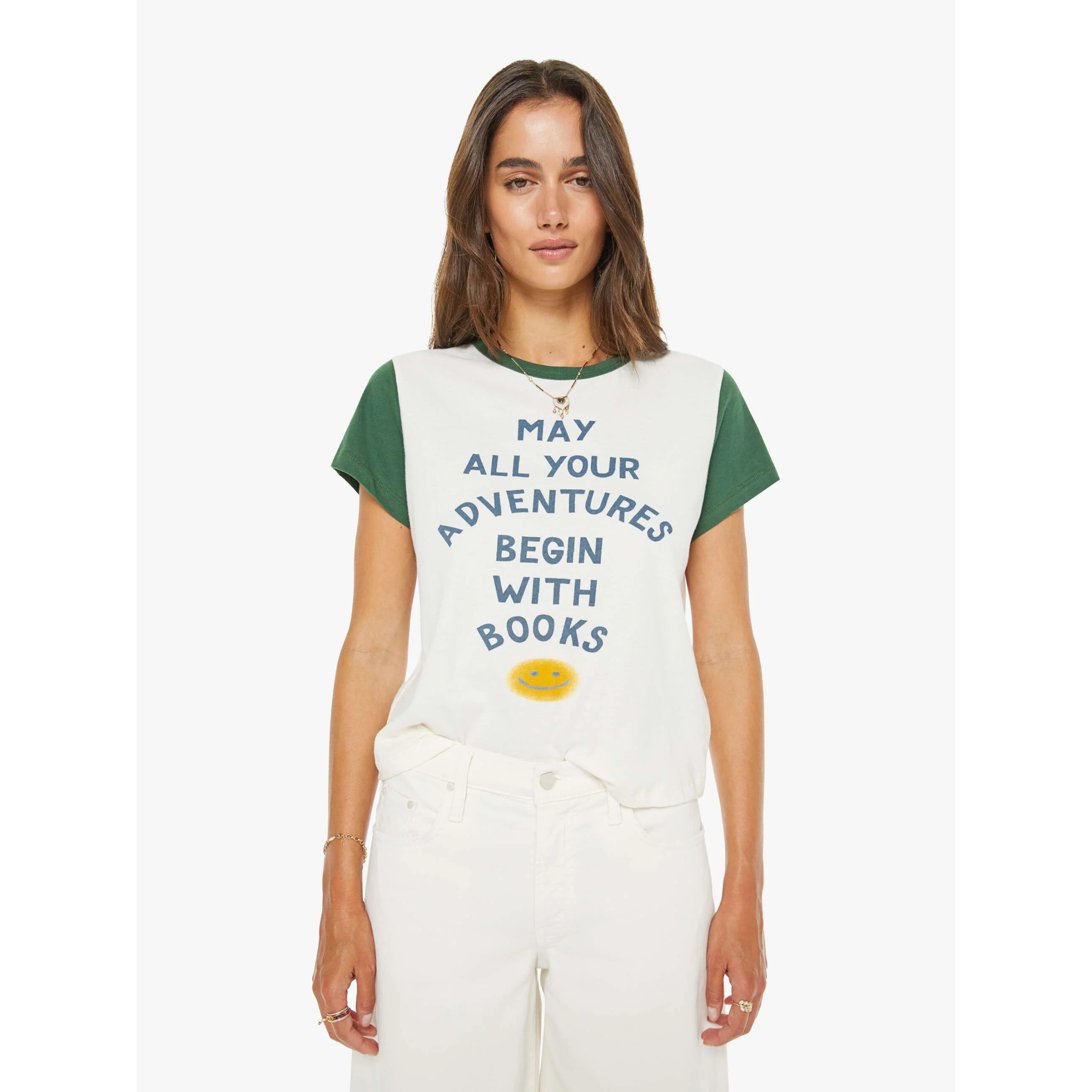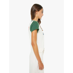 meet the goodie goodie ringer in book adventures from MOTHER. this crewneck tee features extra-short sleeves and a slightly shrunken fit for a playful, vintage-inspired look. crafted from 100% supima cotton in off-white with green trim, it’s finished with blue block text and a smiley face graphic at the front for a fun, graphic touch.