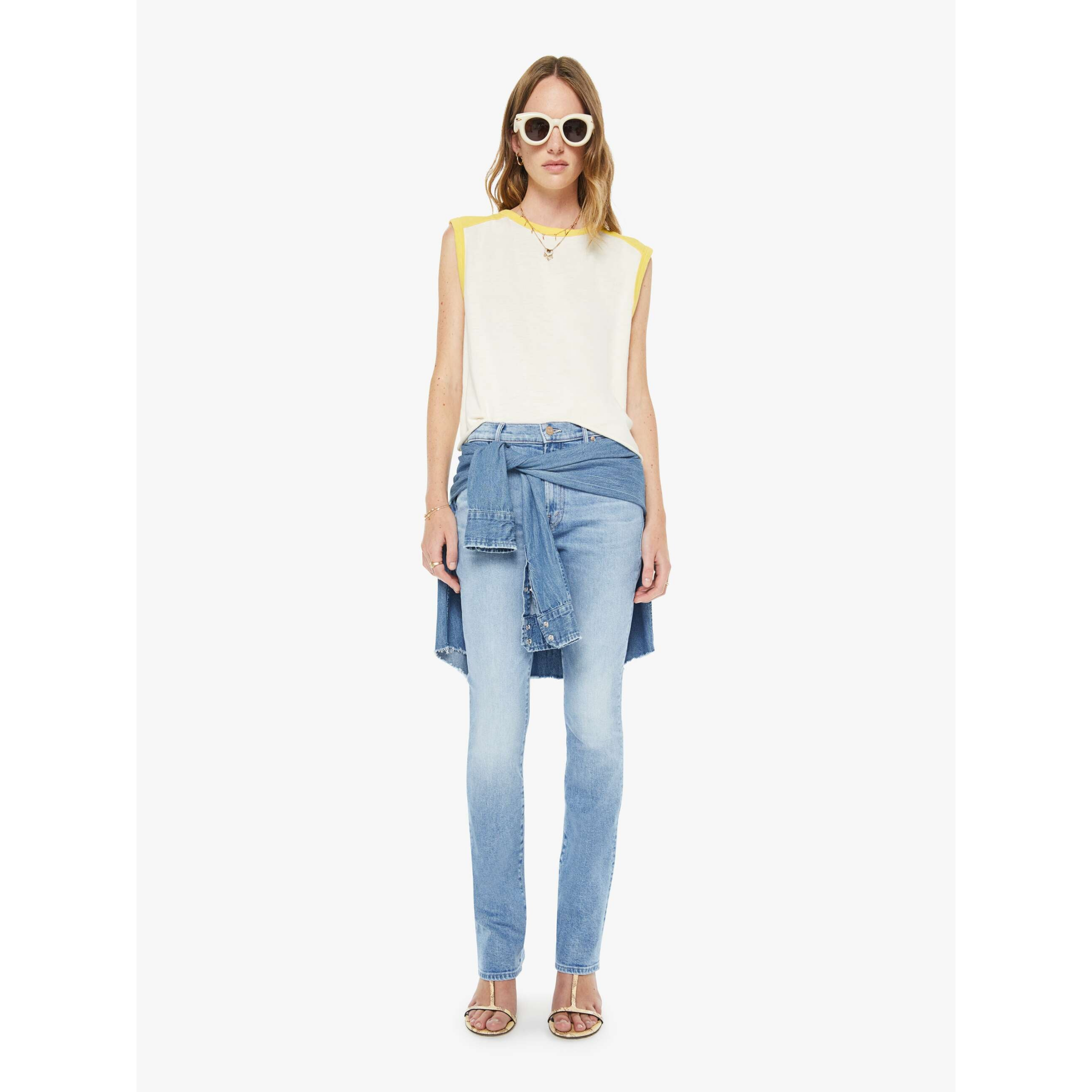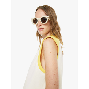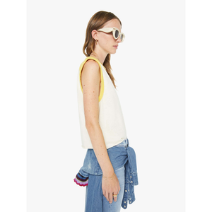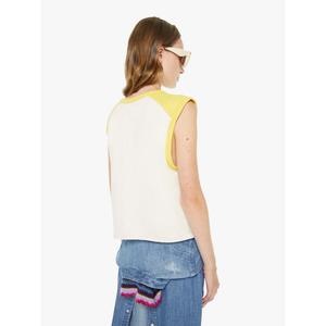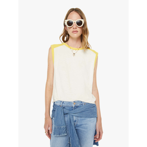 a vintage-inspired crewneck raglan tee with cutoff sleeves and a raw hem. made from superior 100% cotton, the top is designed in off-white with faded yellow trim. made in los angeles utilizing fine imported materials.