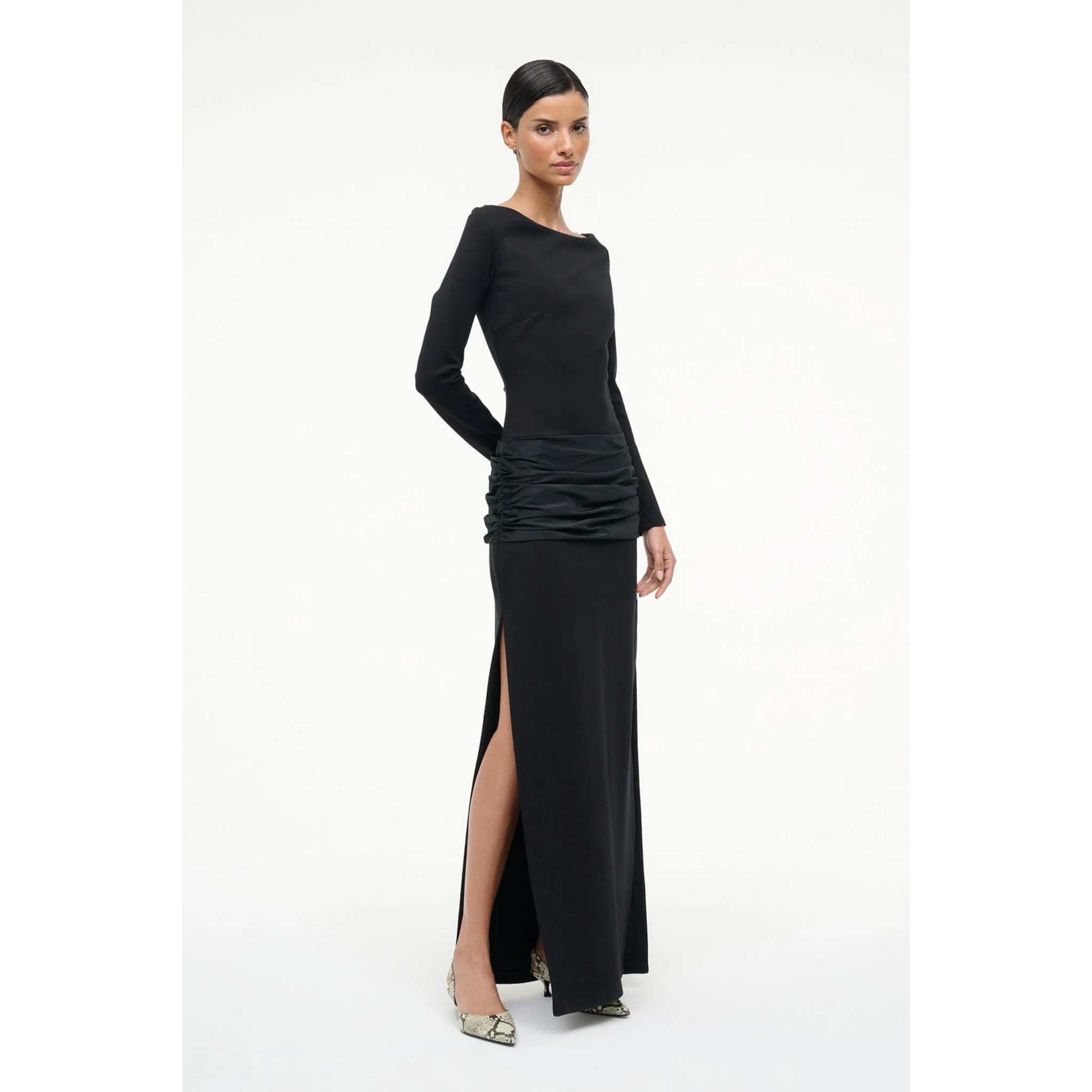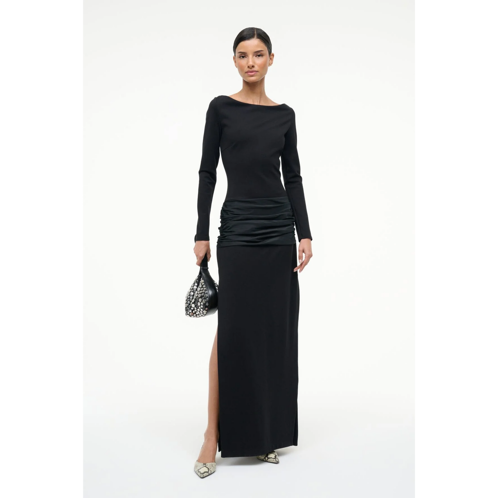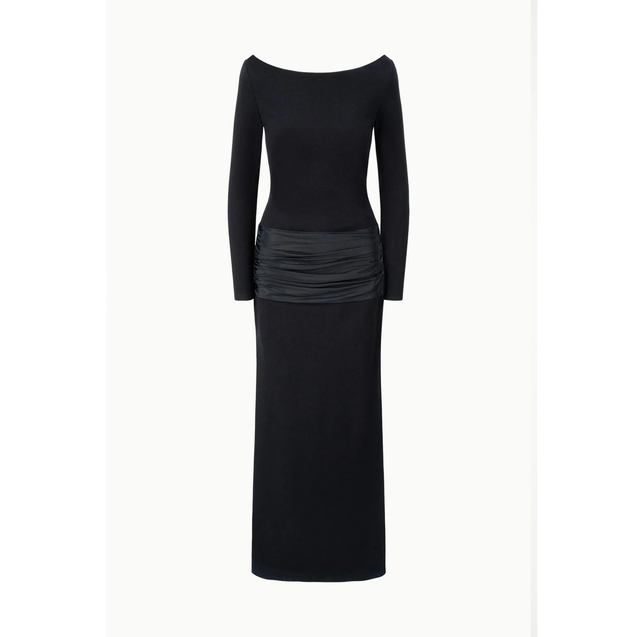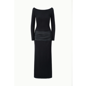 meet the holland dress in black from STAUD. the holland dress is a long sleeve boat neck dress with a ponte body and a contrast taffeta draped waist detail.