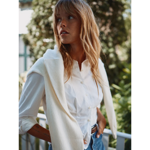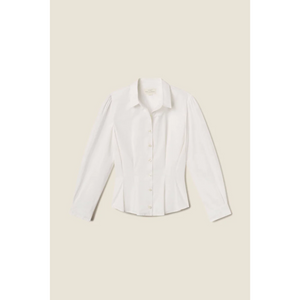 meet the valentina blouse in white from TROVATA. this crisp cotton poplin button-down is designed to last for years, softening with every wash. finished with antique white buttons and darts along the waistline, it offers a more tailored fit while keeping timeless appeal.