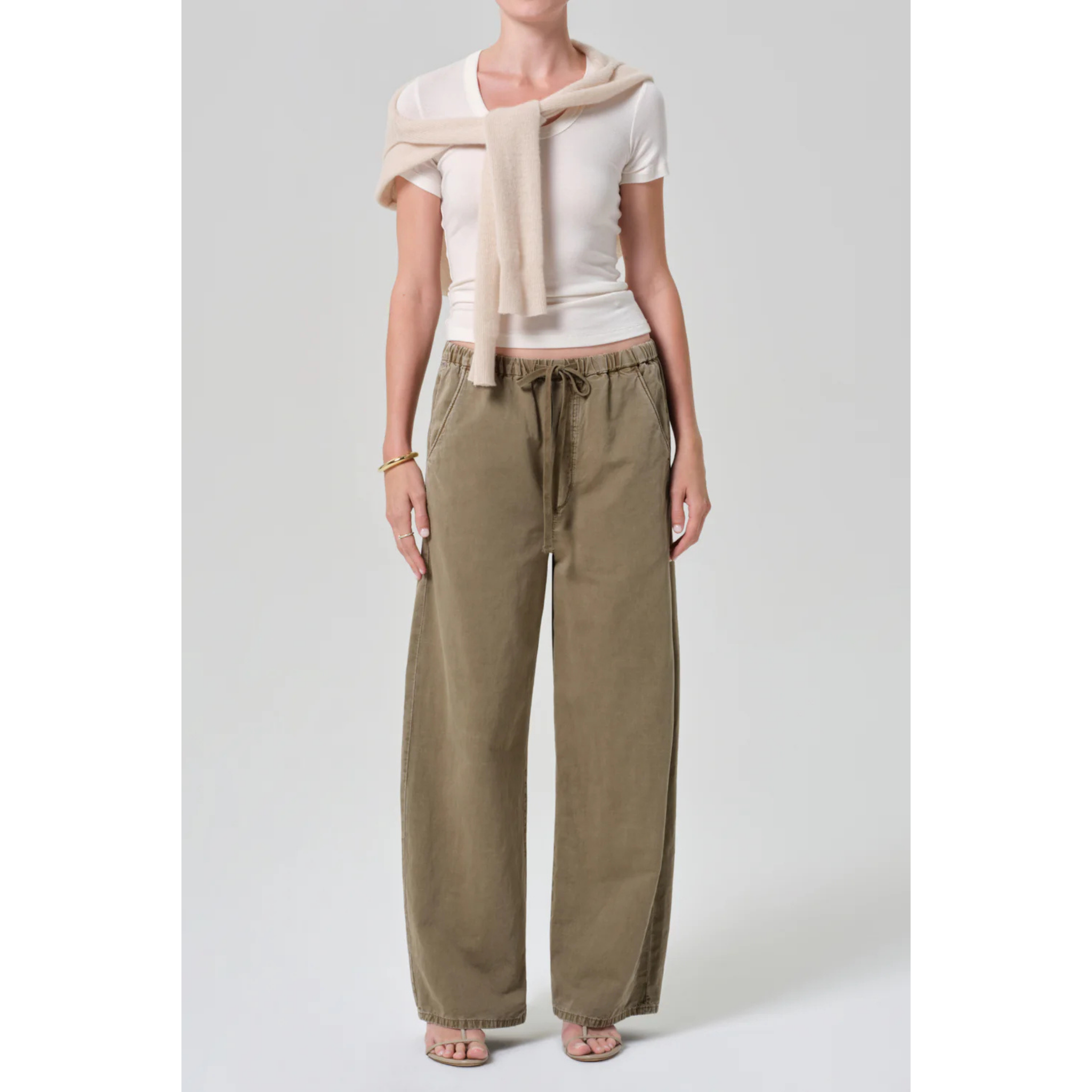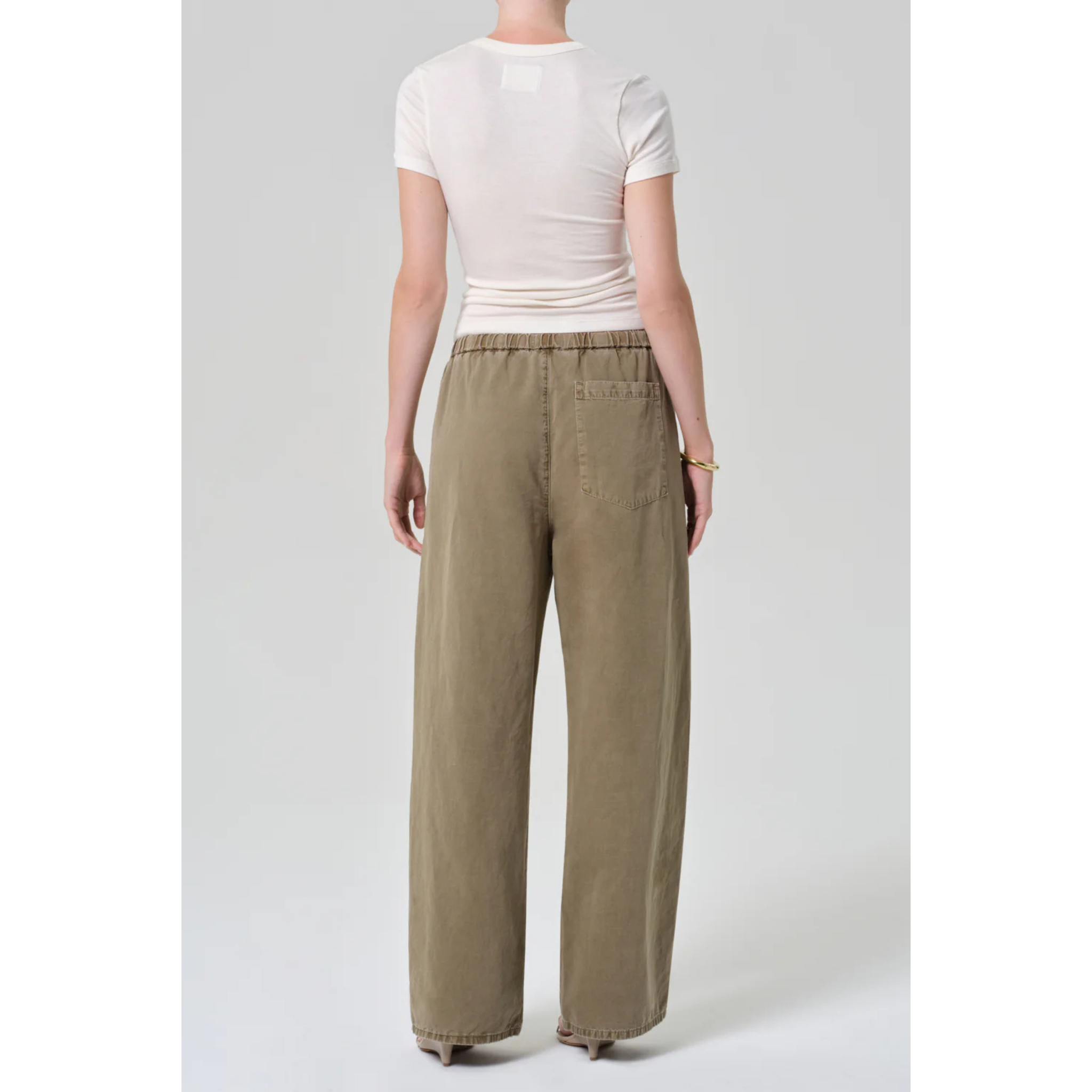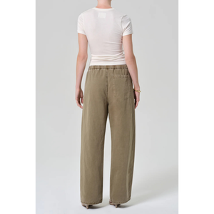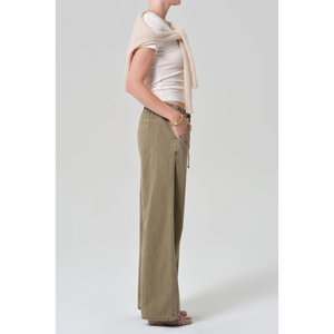 meet the aurora pull on in bezal from CITIZENS OF HUMANITY. crafted from an airy italian twill—a refined blend of cotton and flax with a soft hand and fluid drape—this style features a high-rise waist, drawstring closure, and full-length wide leg for effortless ease with tailored polish. the neutral hue brings warmth and dimension to transitional styling, perfect with a tonal top or crisp button-down for an understated, modern set.