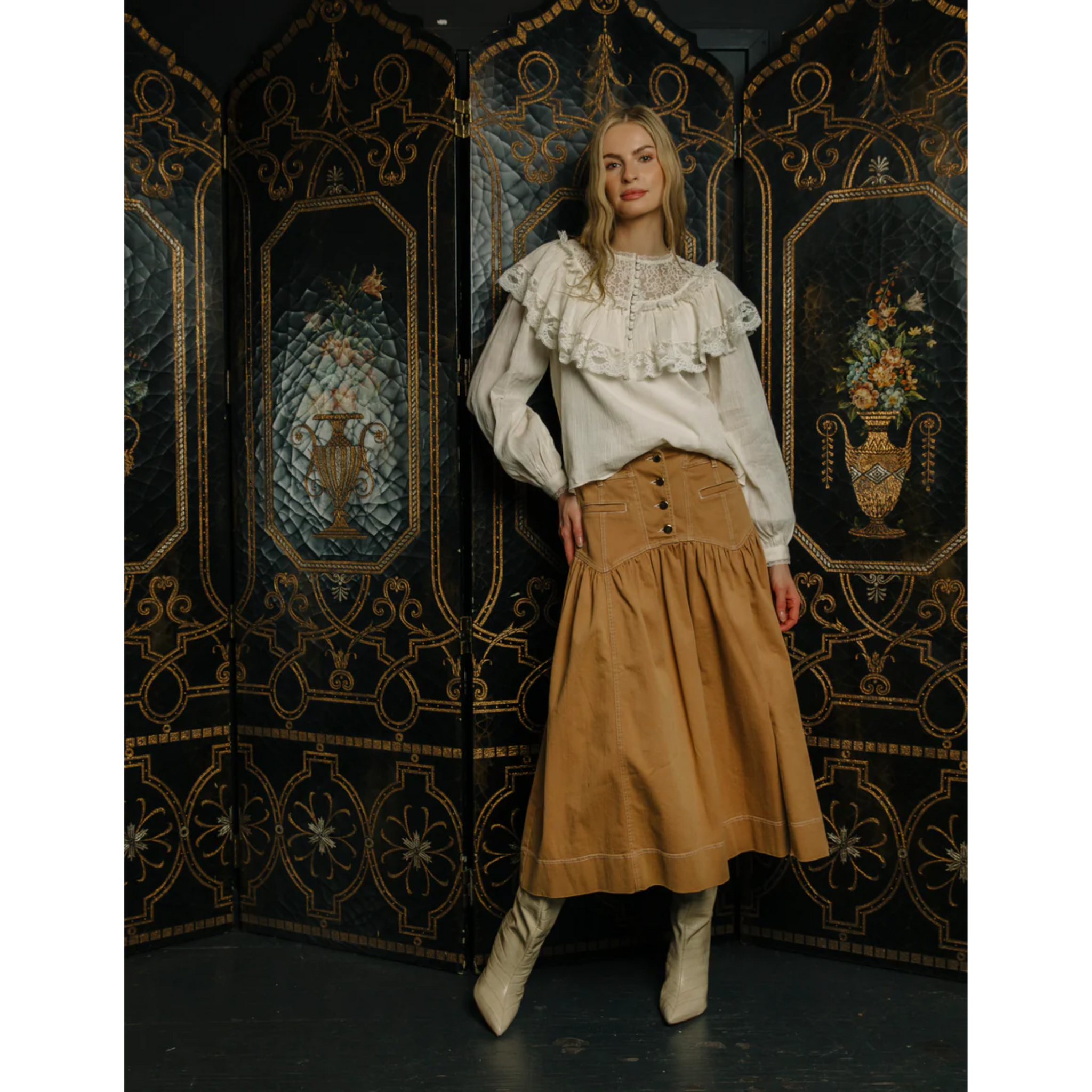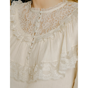 a romantic blouse adorned with cascading lace ruffles and delicate sheer panels. finished with fabric-covered buttons inspired by ancient lacework, this feminine silhouette channels timeless vintage charm.