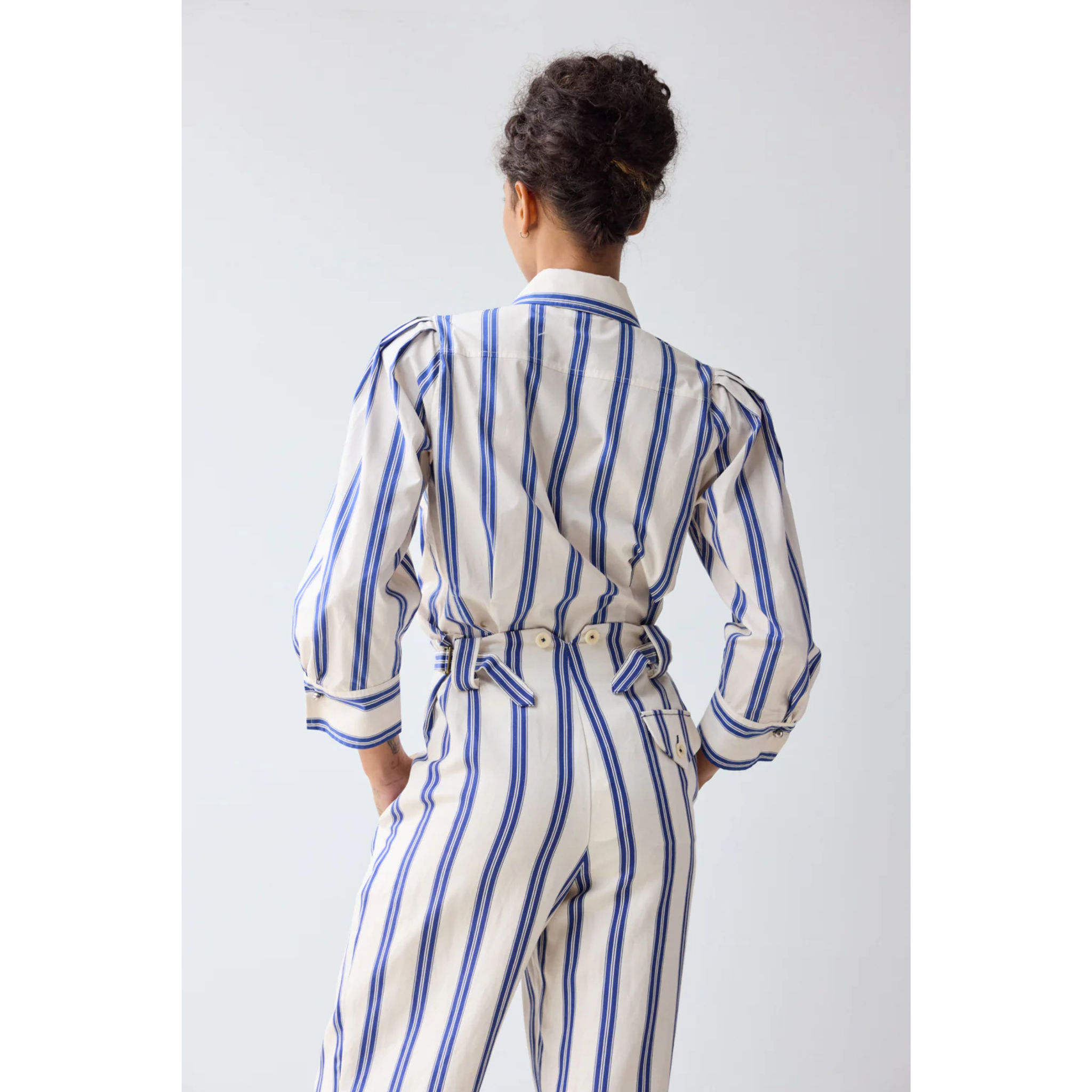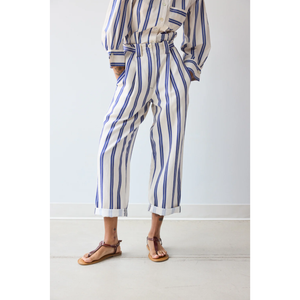 meet the cuffed pant in custard rep stripes. crafted from a breathable blend of 57% tencel™, 26% linen, and 17% cotton, this relaxed silhouette features a cropped, tapered leg for effortless polish. front pleats and besom pockets lend tailored structure, while adjustable belts at the side waist allow for a customizable fit.