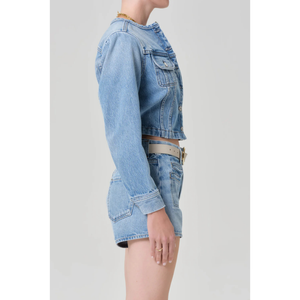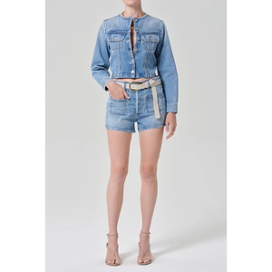 meet the devin collarless jacket in cecil from CITIZENS OF HUMANITY. crafted from regenerative cotton denim, the devin features a light-to-medium indigo wash with soft fading and marbling for a naturally lived-in look. the shrunken, cropped silhouette and collarless neckline lend a modern, flattering shape. effortless layered over tees or lightweight knits—an elevated essential for every season. this fit is true to size.
