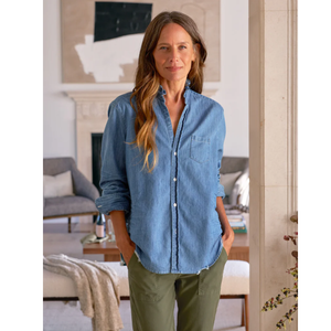 meet the eileen ruffle button-up shirt in vintage stonewashed indigo from FRANK & EILEEN. this iconic, relaxed-fit silhouette features a feminine ruffled collar, signature bust-flattering button placement, and a hand-distressed raw shirttail hem. crafted from legendary indigo denim that softens and fades beautifully over time, it’s a timeless classic with an elevated twist.