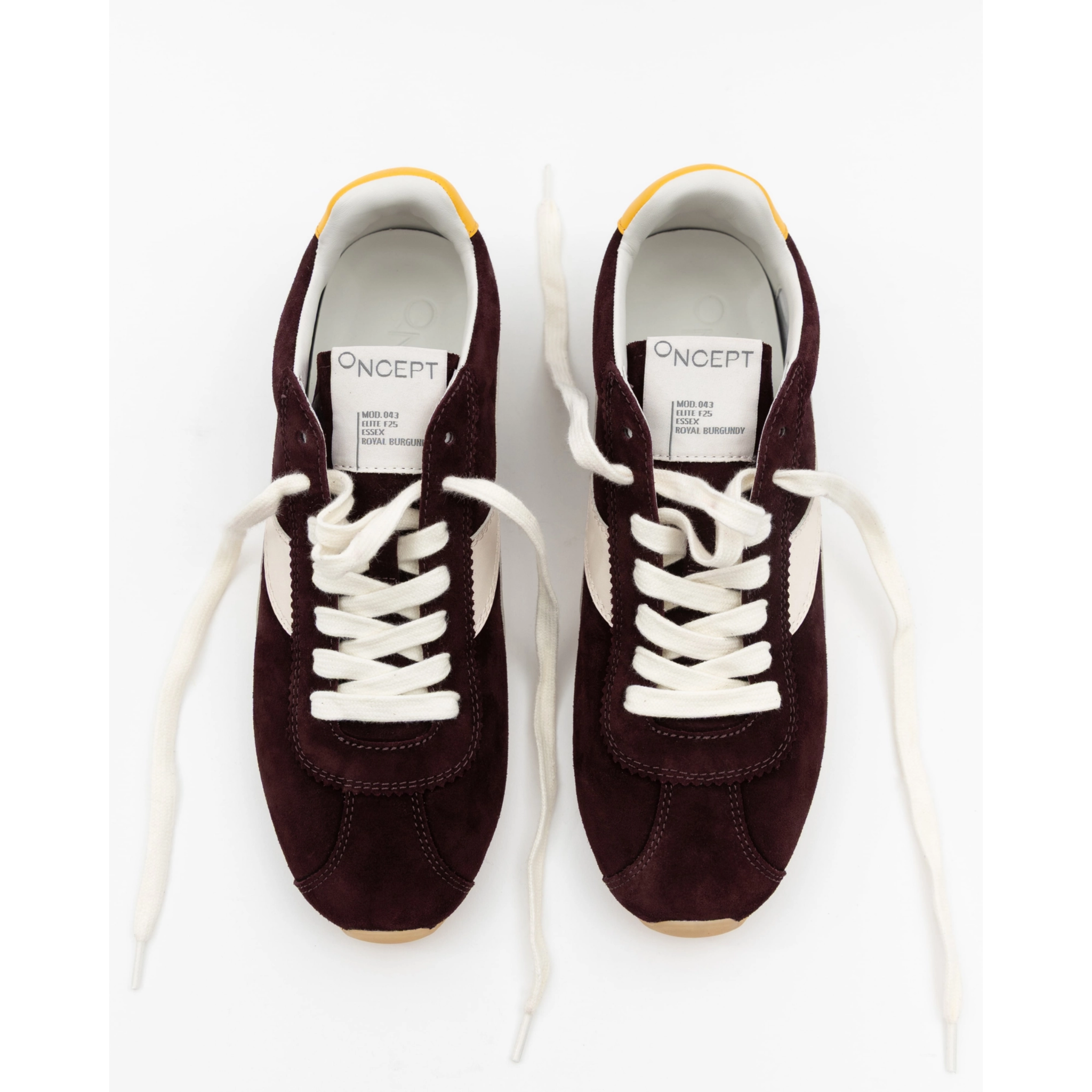 meet the essex in royal burgundy from ONCEPT. this ultra-lightweight take on the classic ballet flat features a sleek, sneaker-inspired silhouette with our signature side swoops. crafted from luxuriously soft suede, it delivers a sophisticated yet relaxed look. the low-profile design and deconstructed construction provide effortless flexibility and comfort, making it the perfect blend of versatility and modern elegance.