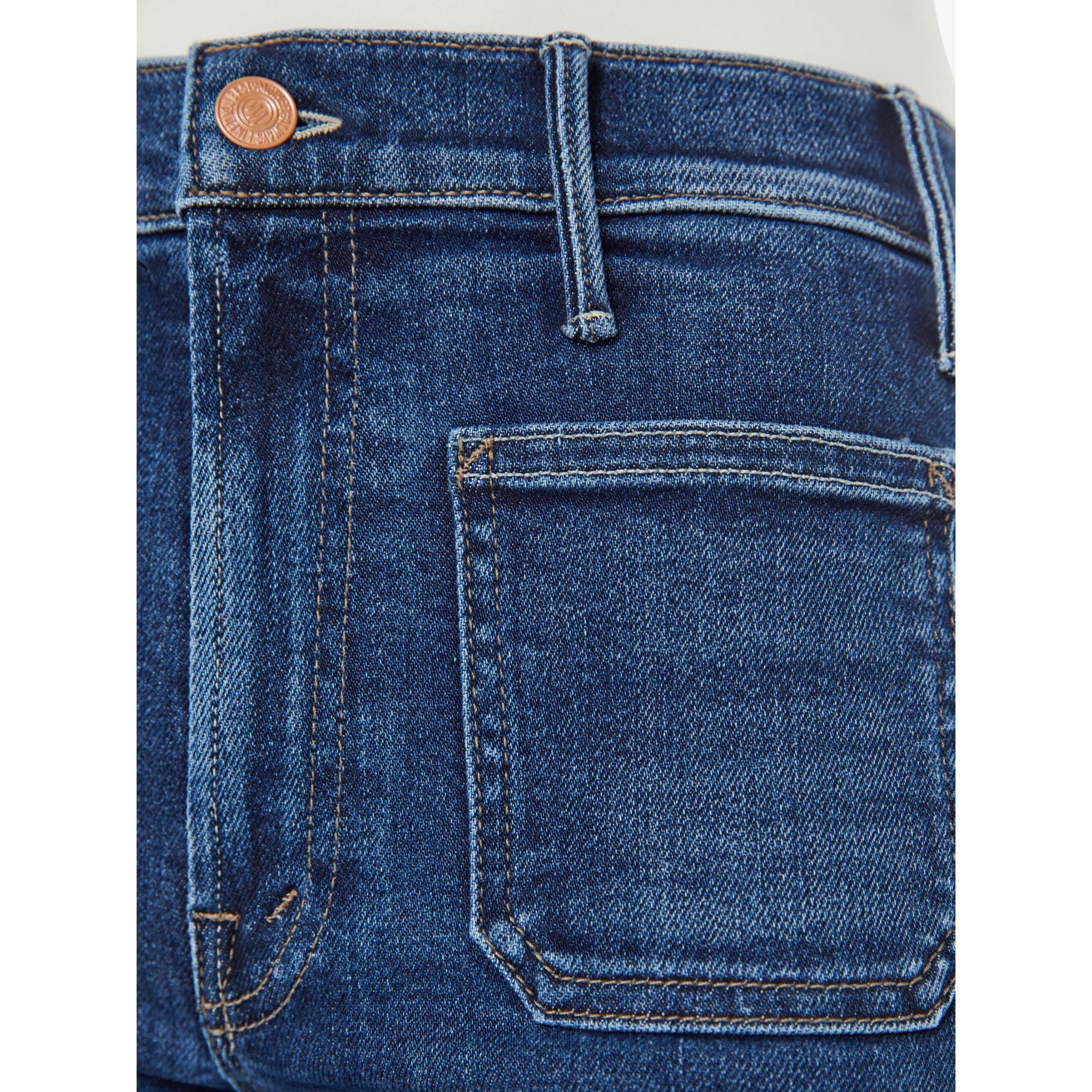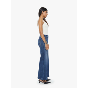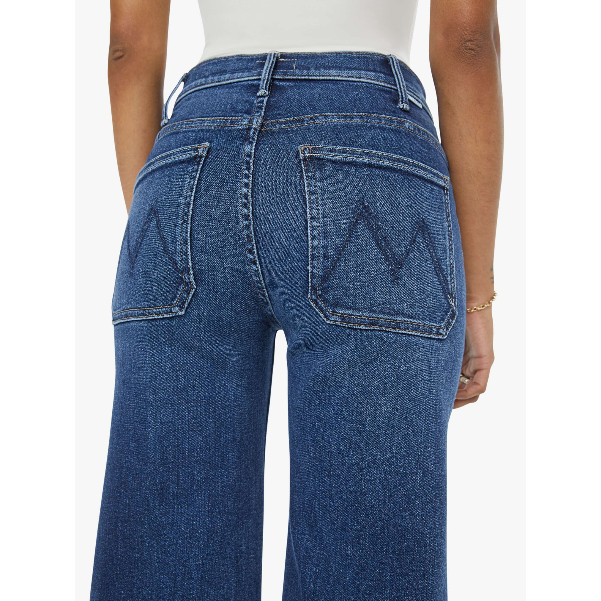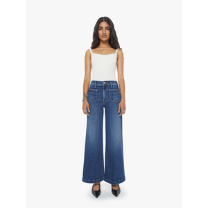 meet the hustler roller patch pocket skimp in one last shot from MOTHER. these 70s-inspired wide leg jeans feature a high rise, zip fly, patch pockets, and a clean hem for a timeless silhouette. crafted from stretch denim in a dark blue wash with subtle whiskering and fading at the knees, this pair delivers a flattering fit with vintage appeal.
