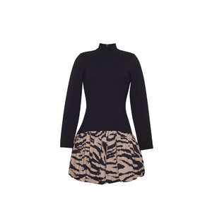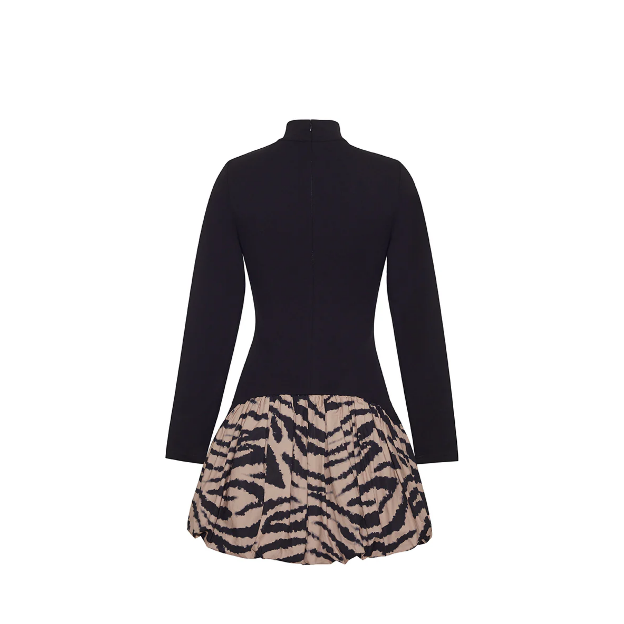 a playful mix of textures and prints, this mock neck mini dress features a sculpted bubble skirt in cotton poplin and a contrasting black ponte bodice. finished with slim sleeves and functional side pockets, it’s a bold yet refined statement piece perfect for any occasion.