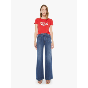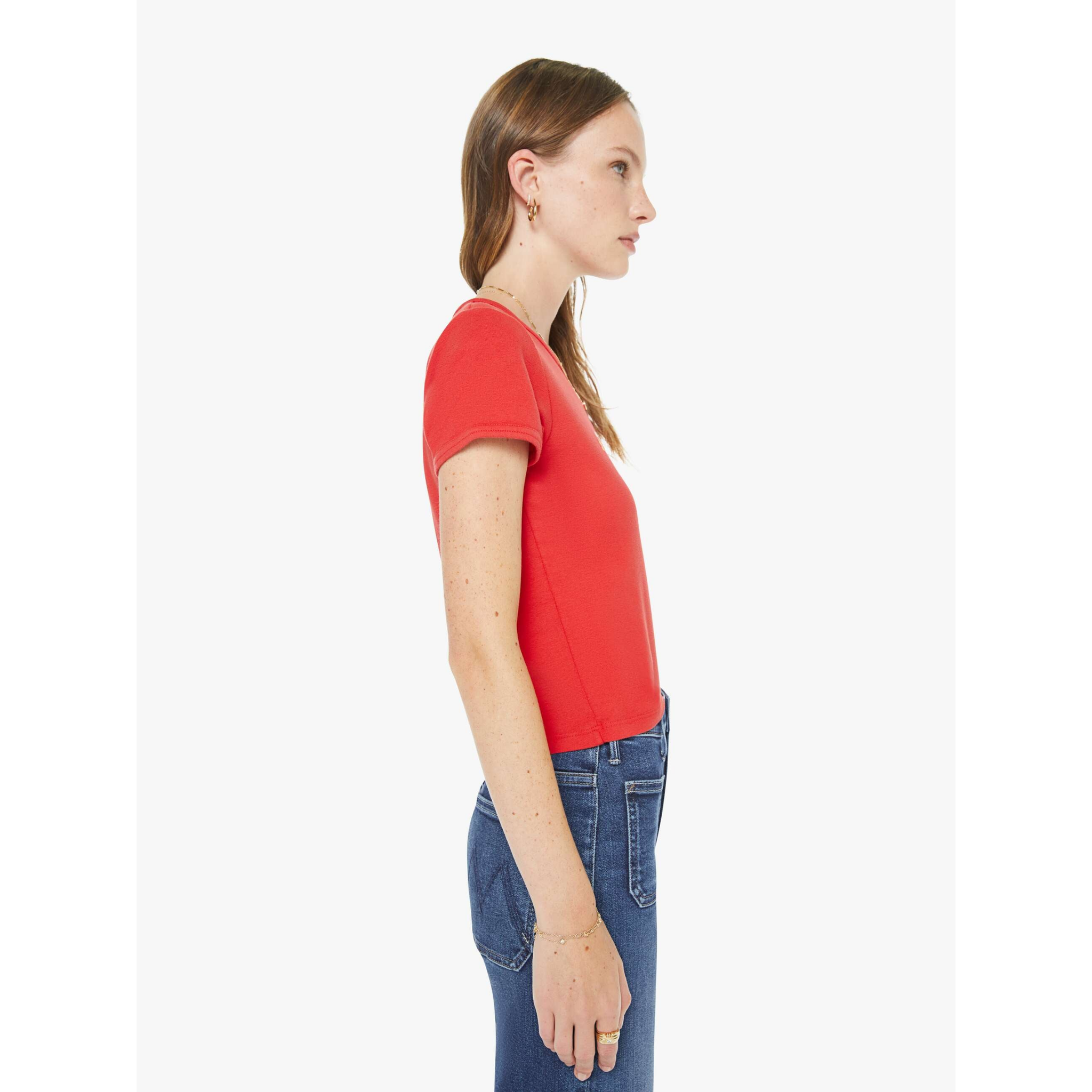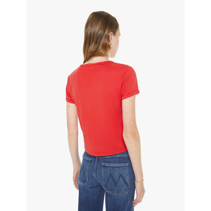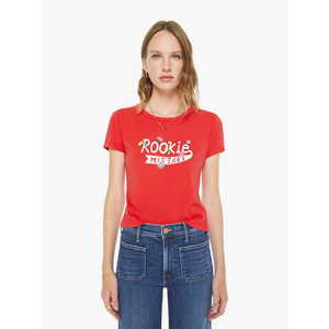 meet the itty bitty ringer in rookie mistake from MOTHER. this shrunken crewneck tee features extra-short sleeves and a cropped hem, crafted from 100% cotton. finished in a bold red hue with a white text and floral graphic, it’s a playful, vintage-inspired staple.