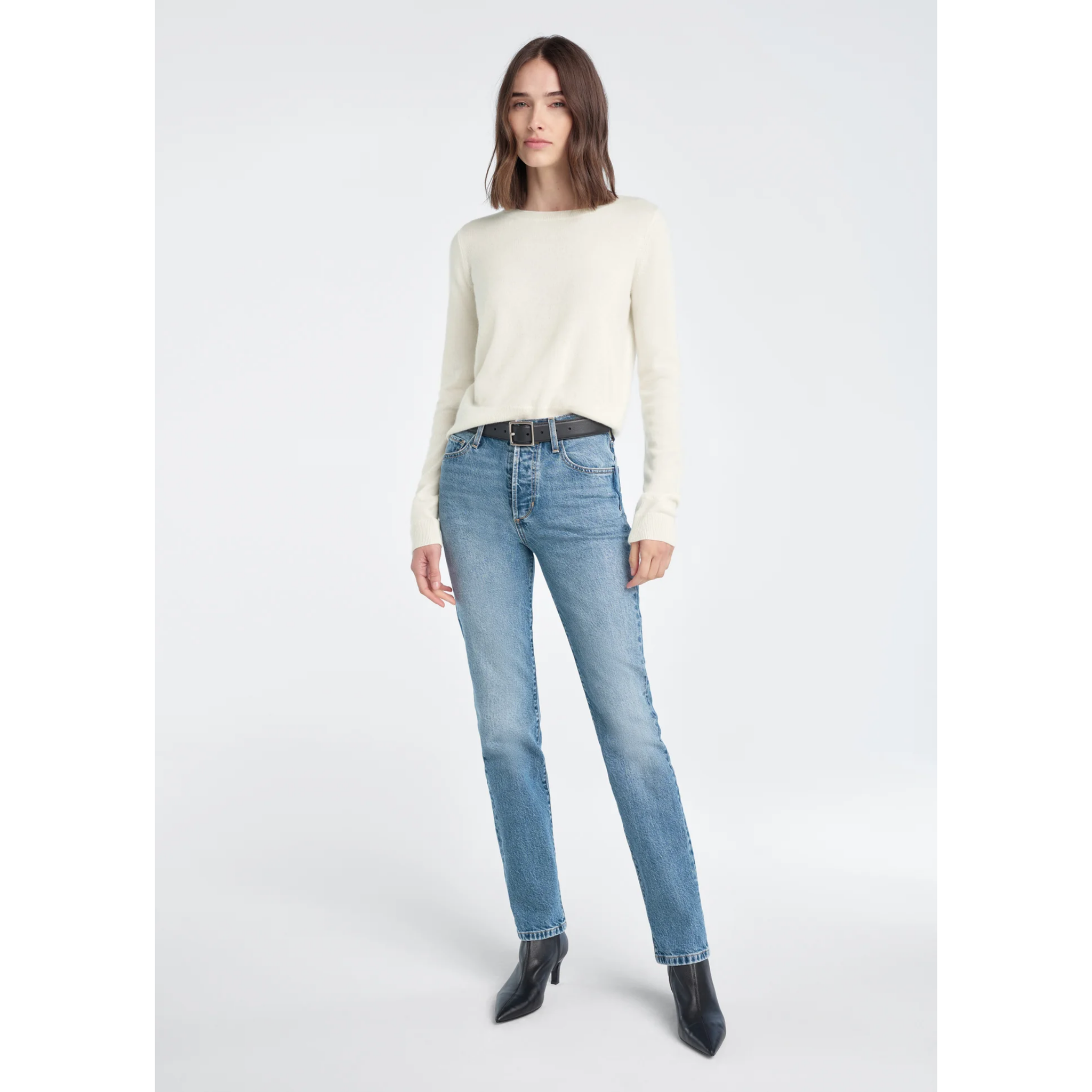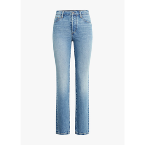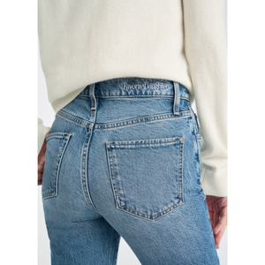 meet the jen mid rise slim straight in haines from FAVORITE DAUGHTER. this mid-rise jean features a slim-straight leg with a two-piece wrap waistband that sits slightly lower at the front and higher at the sides and back, offering a flattering, structured fit. finished in a vintage medium-light blue marble wash with whiskering and fading, it’s a timeless everyday denim with just the right amount of give.