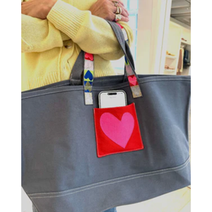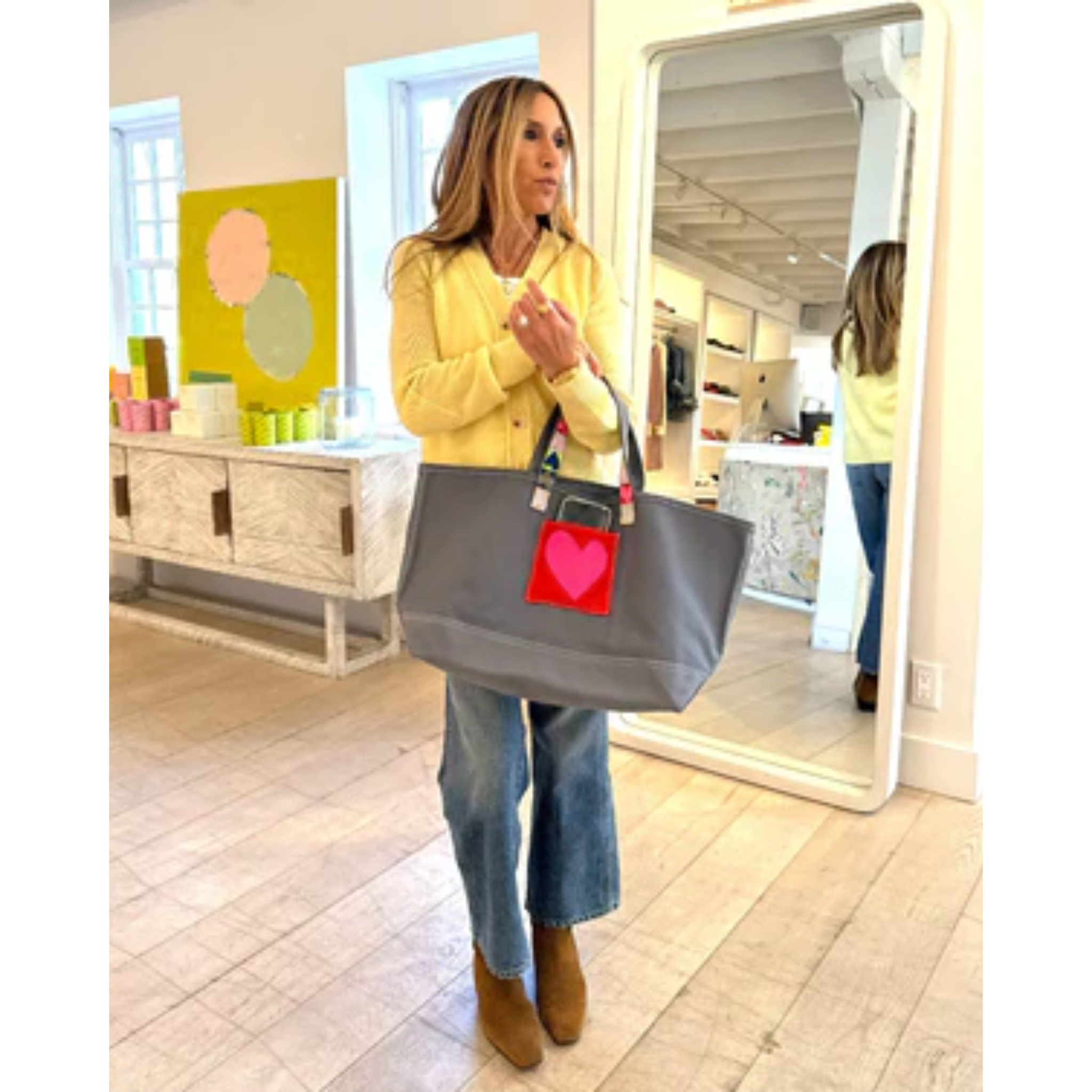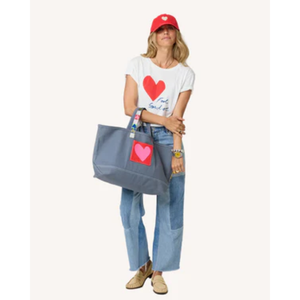 meet the love all over tote in french blue from KERRI ROSENTHAL. this gently structured canvas tote features an imperfect heart patch pocket on the front and love brigade taping on the handles. spacious enough to fit your laptop, spare flats, and a cosmetics pouch, it’s a feel-good everyday carryall with signature charm.