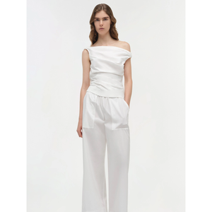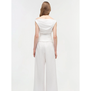 meet the maisel draped cotton top in white from SIMKHAI. this draped top is cut from crisp cotton poplin and defined by a clean boat neckline and a softly ruched bodice.