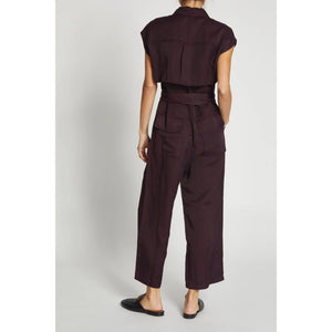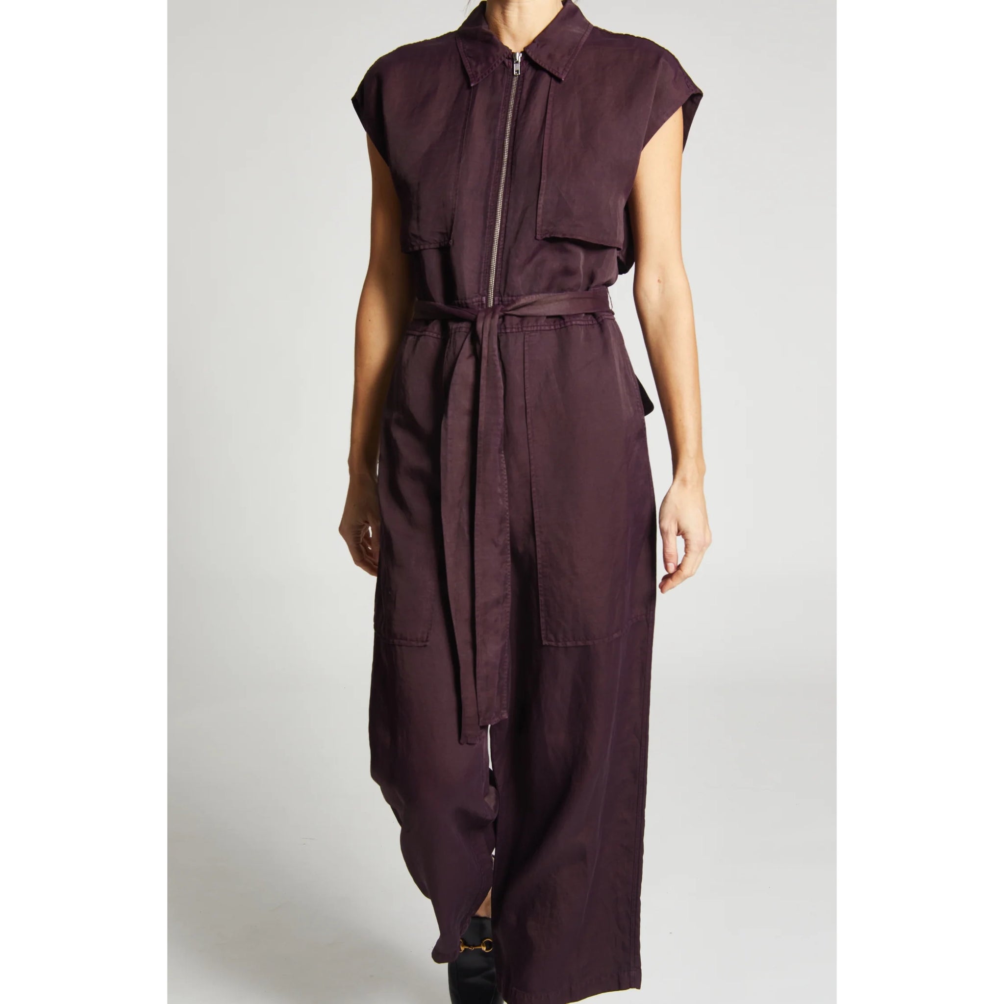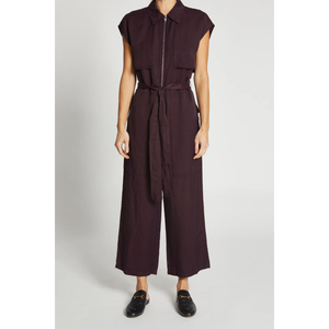meet the maxine cargo jumpsuit in fig from SAINT ART. this short sleeve cargo jumpsuit is a versatile and stylish addition to your wardrobe. made with a super soft blend of cotton and tencel, this jumpsuit features a garment dye wash that creates a beautiful tone of dark burgundy. the exposed zipper front and utility details with pockets add a touch of functional charm. complete with a removable tie at the waist, this jumpsuit is perfect for effortless and comfortable everyday wear.