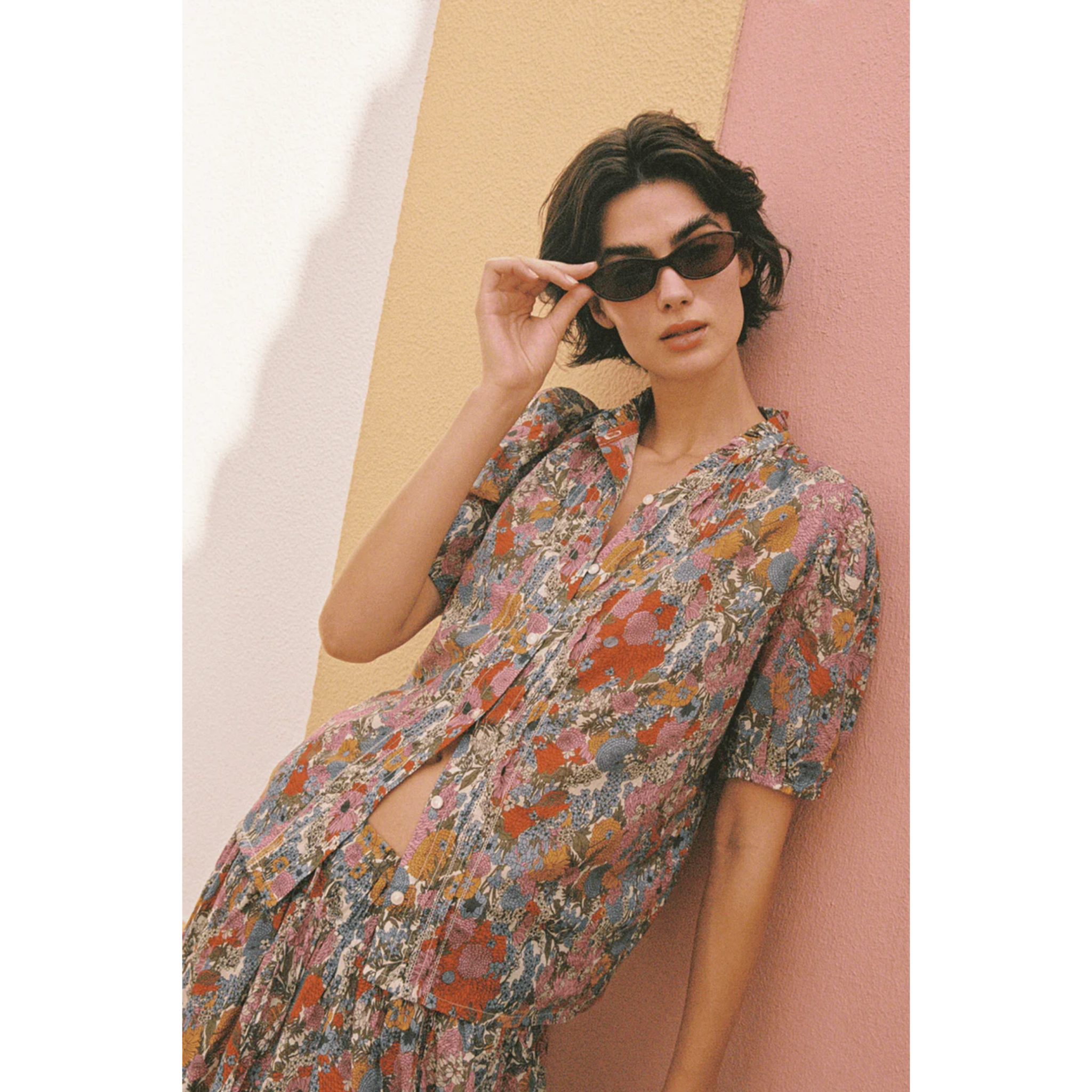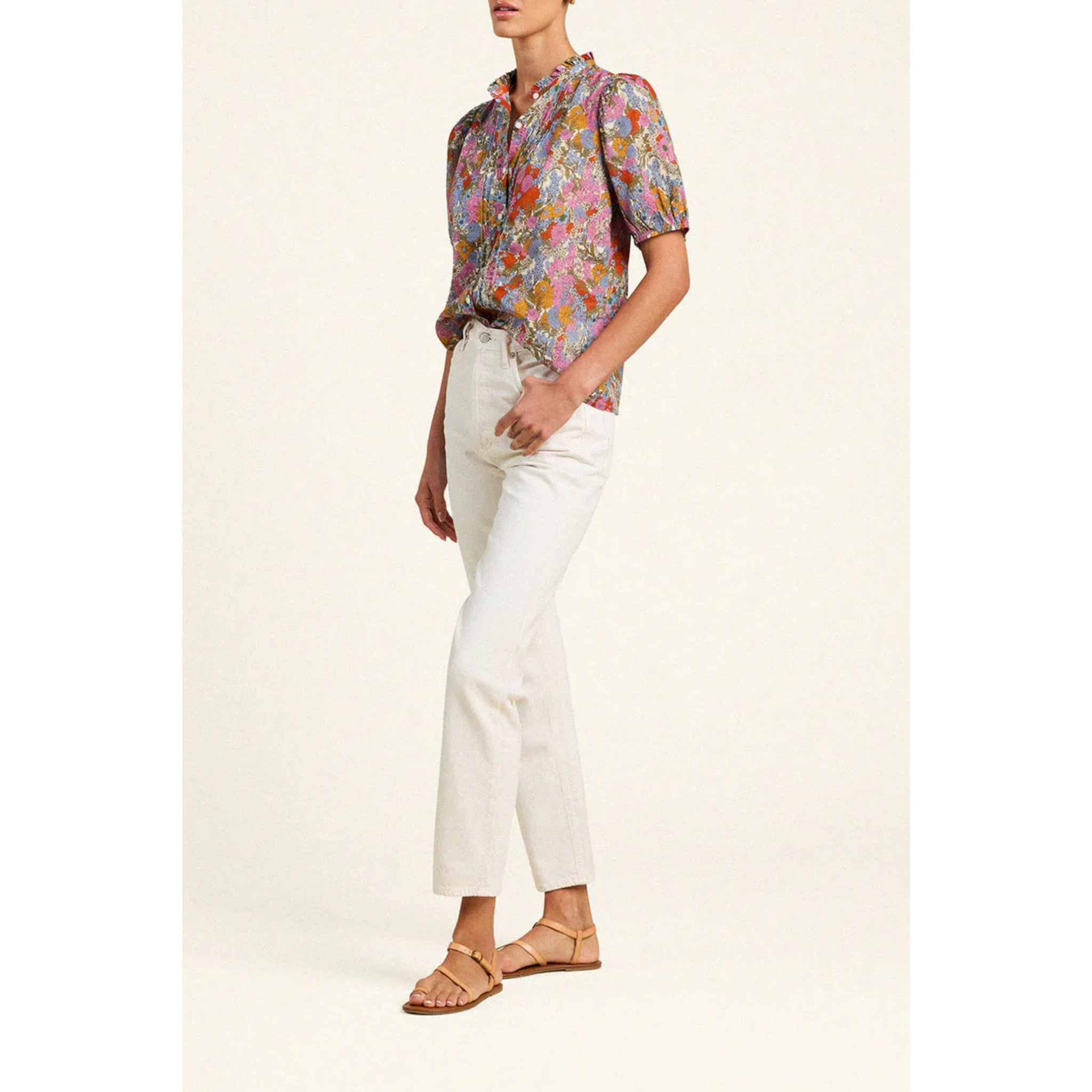 a short-puff sleeved blouse with a straight hemline, petite pintucks for texture, and a slightly cropped length for an airy, whimsical fit. crafted from soft cotton voile, perfect for breathable summer layering.