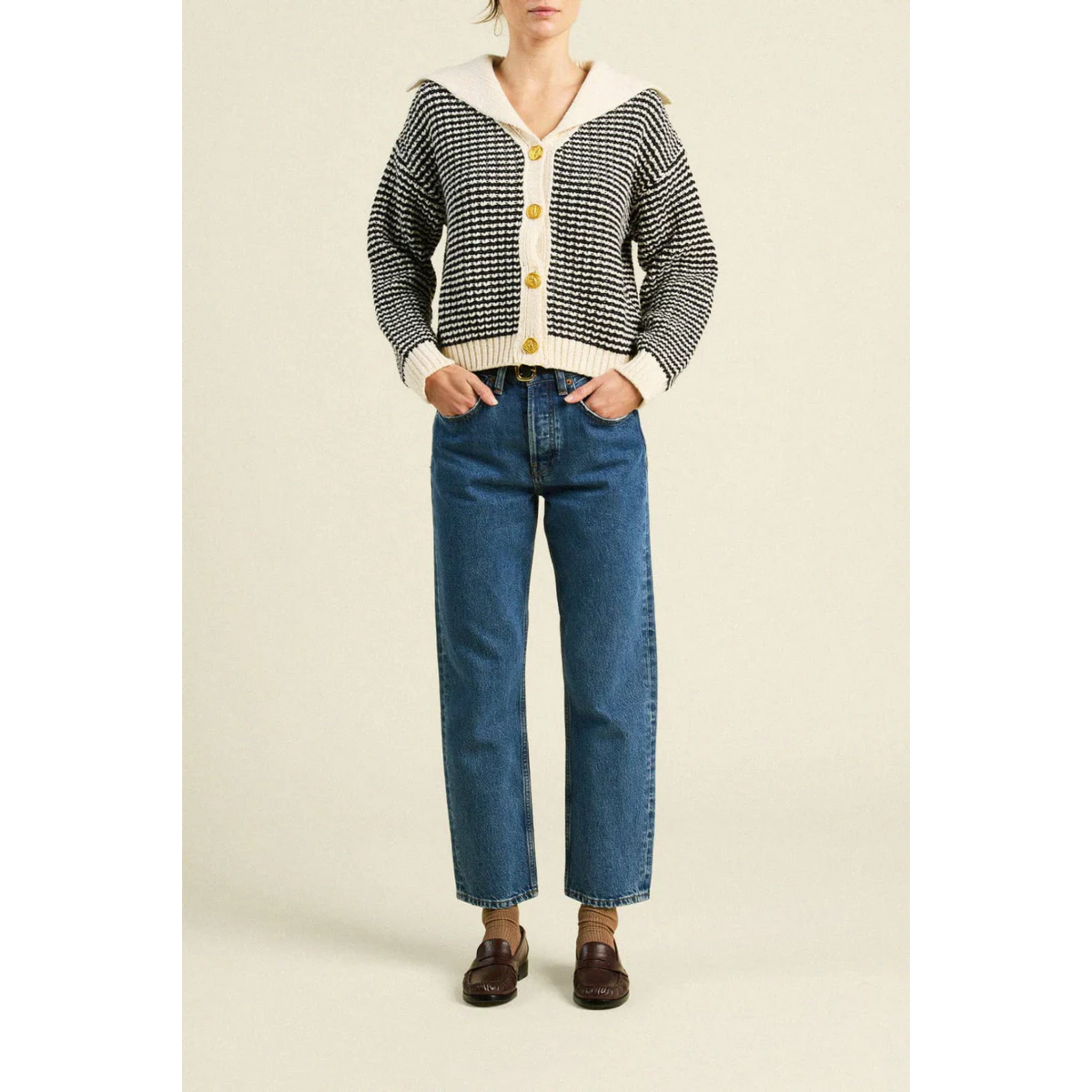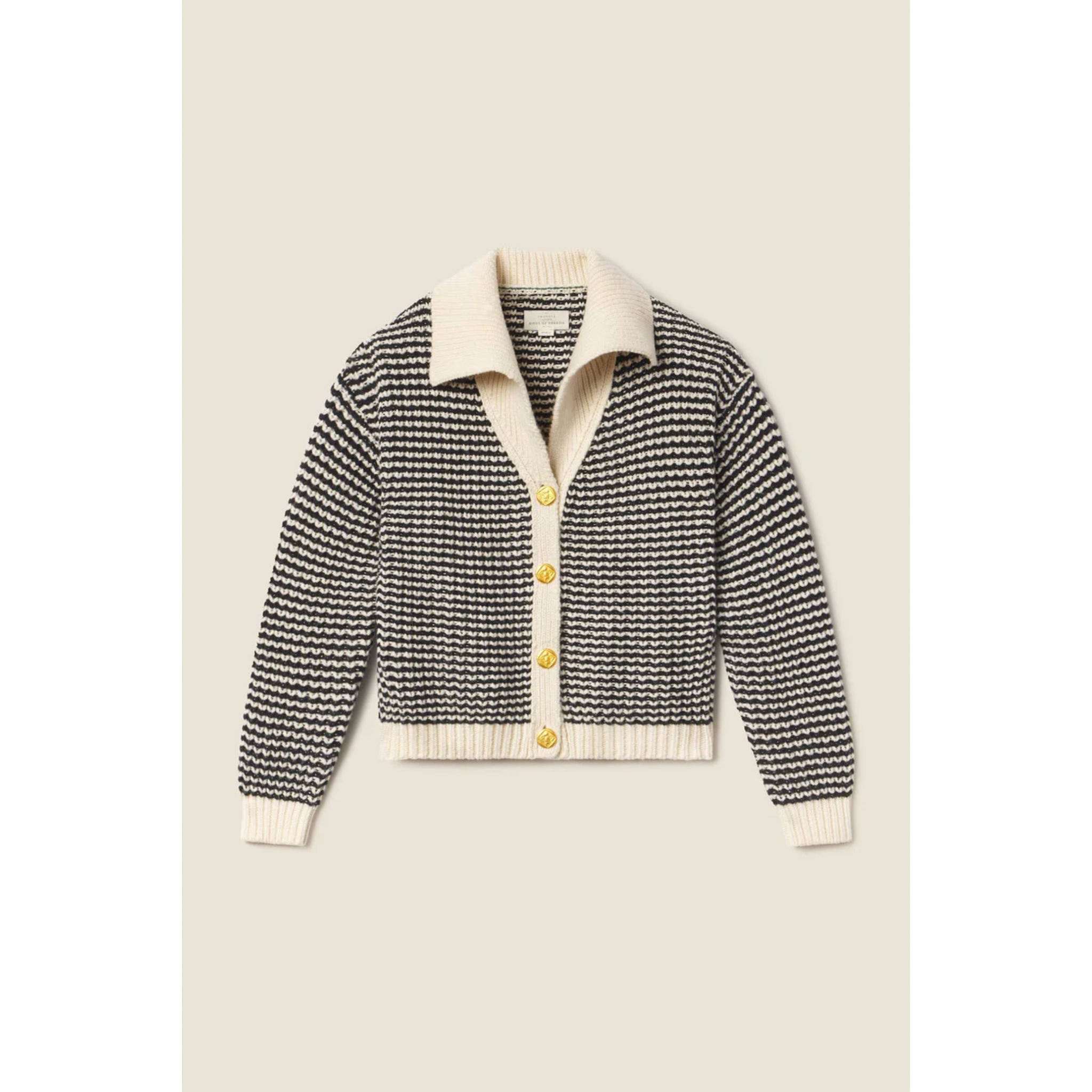 meet the savannah cardigan in antique white & black stripe from TROVATA. the savannah cardigan features a textured basket weave with a cream sailor collar and cuffs, finished with TROVATA’s signature gold owl buttons. shown here in antique white & black stripe and made from merino wool.