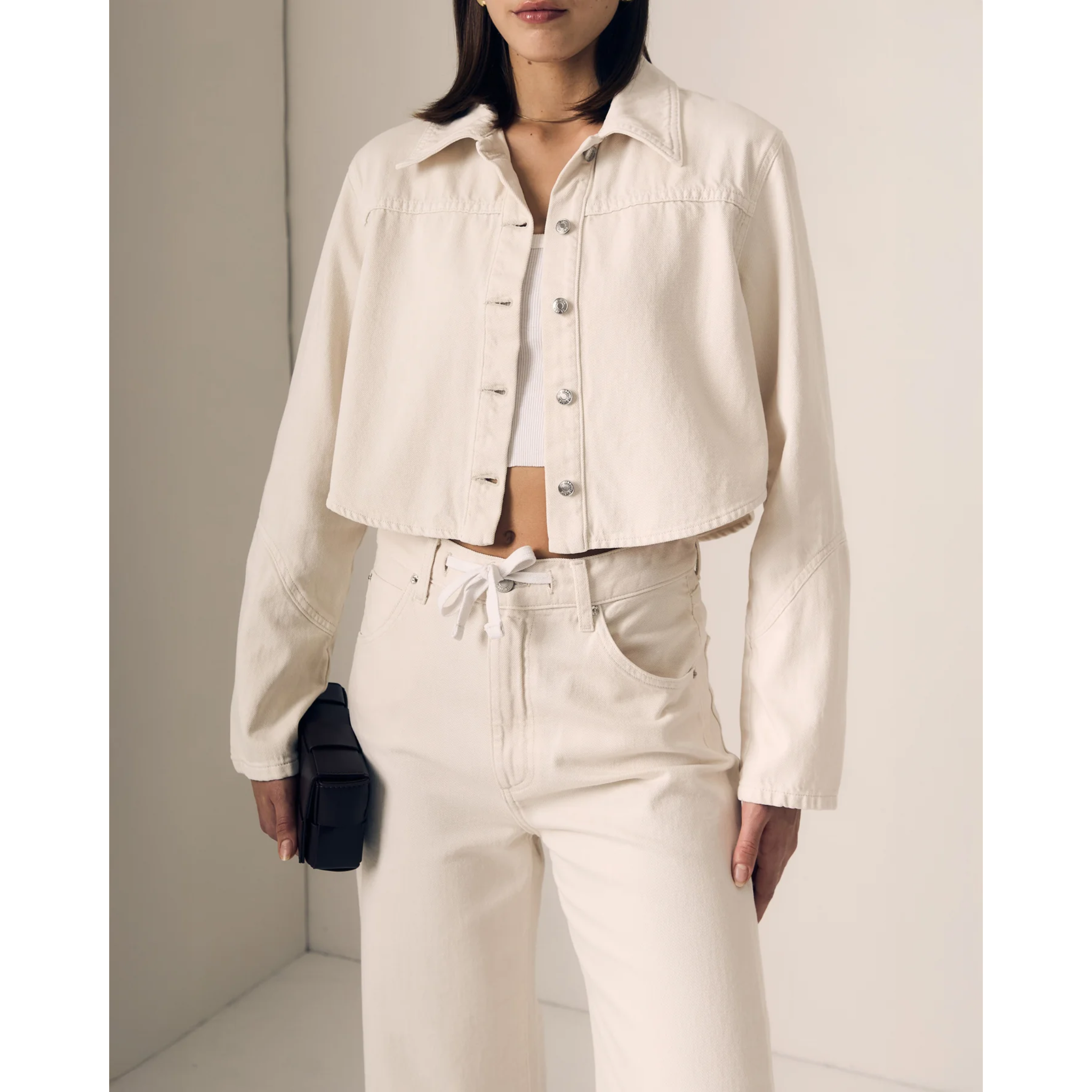 crafted from lightweight, ultra-soft denim, this modern layer is accented with distinctive chrome-finished silver buttons for an elevated touch. designed to fit true to size, it features a 19” length from shoulder to hem and classic button fastening.
