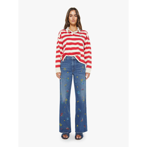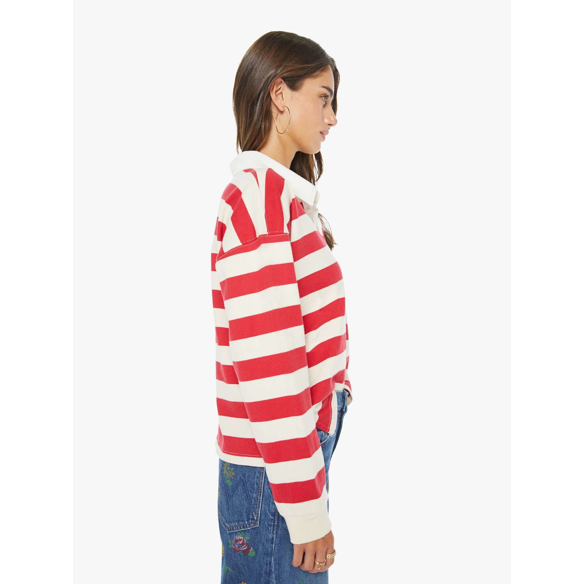 meet the boxy match in tango red and cream from MOTHER. this rugby-style top features drop shoulders and an oversized fit, crafted from a recycled cotton blend. finished in off-white and red stripes with a fuzzy lamb patch at the chest, it’s a sporty, standout piece with vintage appeal.