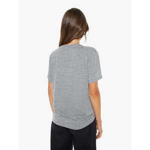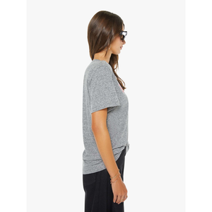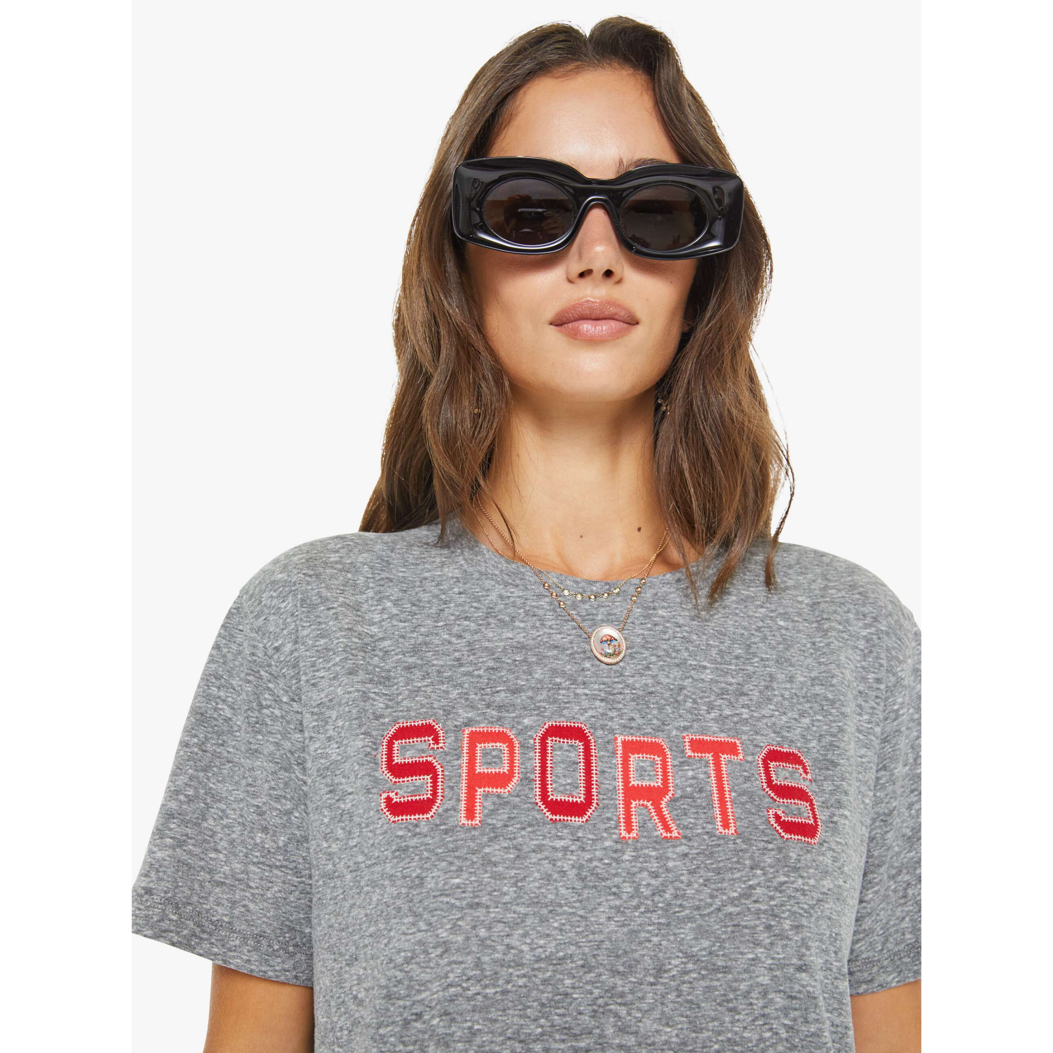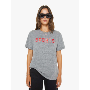 meet the rowdy in sports from MOTHER. this crewneck tee features an oversized fit and a clean hem, crafted from a soft cotton blend. finished in heathered grey with red letter patches on the front, it’s a sporty, casual staple with vintage appeal.