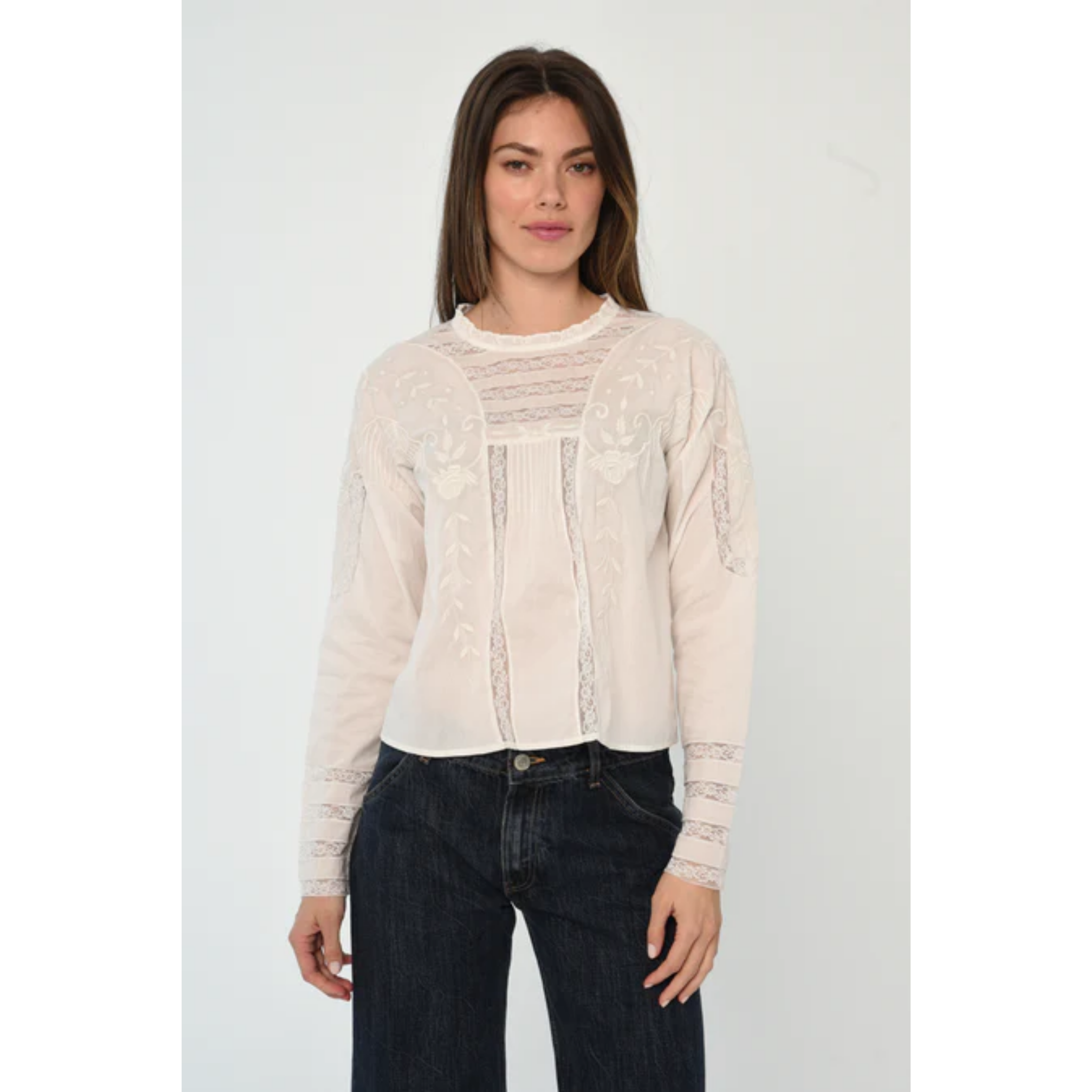 this vintage-inspired piece features floral embroidery on the front bodice and lace insets on both the bodice and sleeves. crafted in Love the Label’s super-soft cotton voile in white, it has a center-back keyhole with button closure. a versatile top that can be worn beautifully in any season.